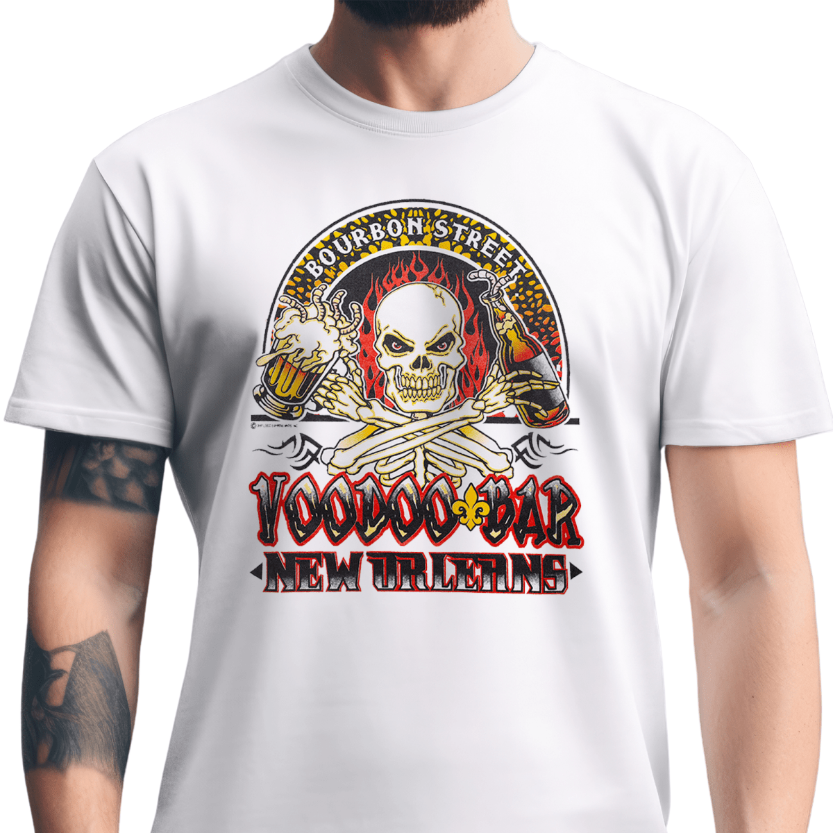 Show off the wild spirit of Bourbon Street with our Voodoo Bar New Orleans T-Shirt. Featuring a bold skull-and-crossbones design, flaming accents, and iconic bar imagery, this tee captures the edgy, nightlife vibe that makes New Orleans unforgettable. Perfect for locals, tourists, and collectors, this high-quality shirt is soft, lightweight, and designed for everyday comfort.