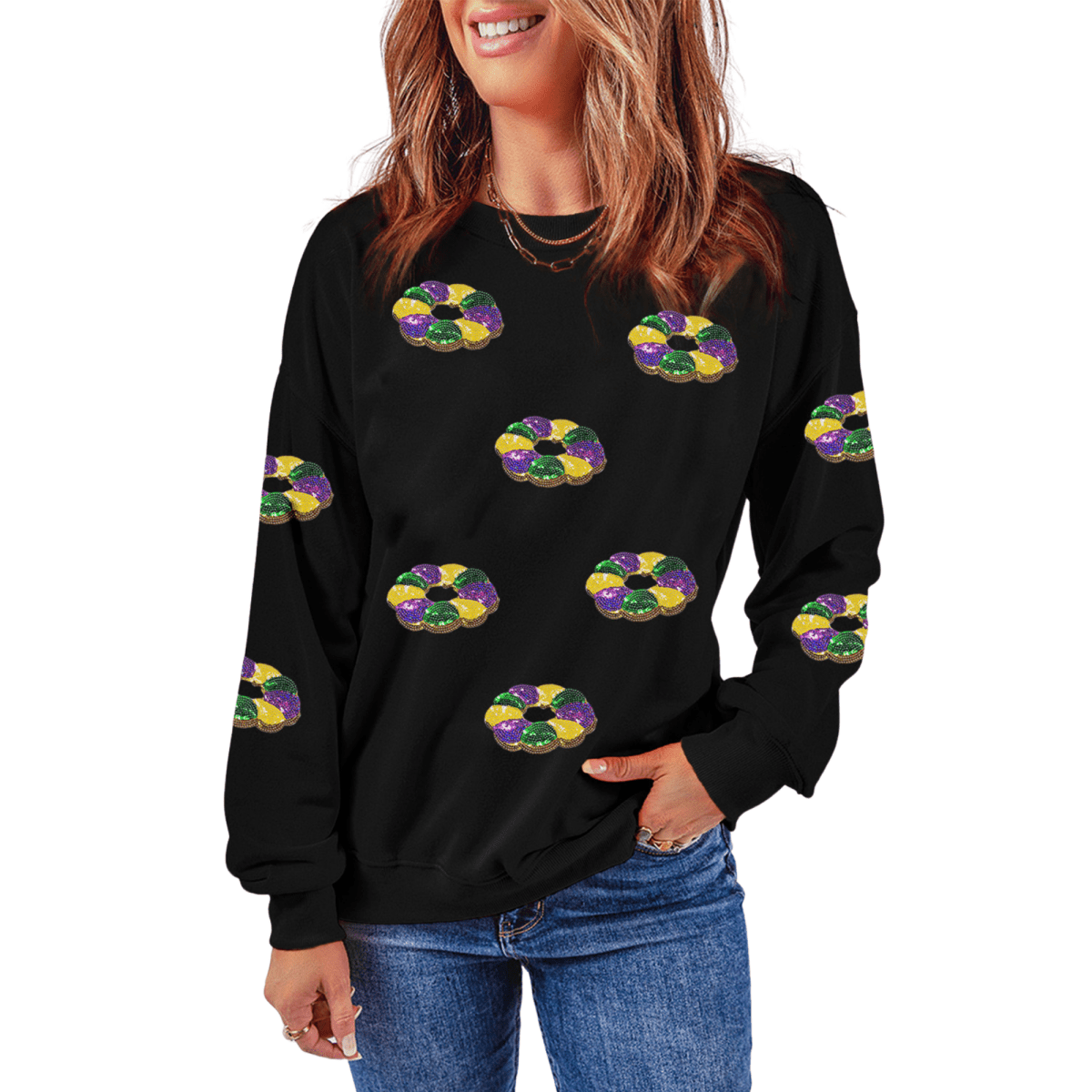 Adult Black Sequined Donuts of Mardi Gras Colors Drop Shoulder Sweatshirt