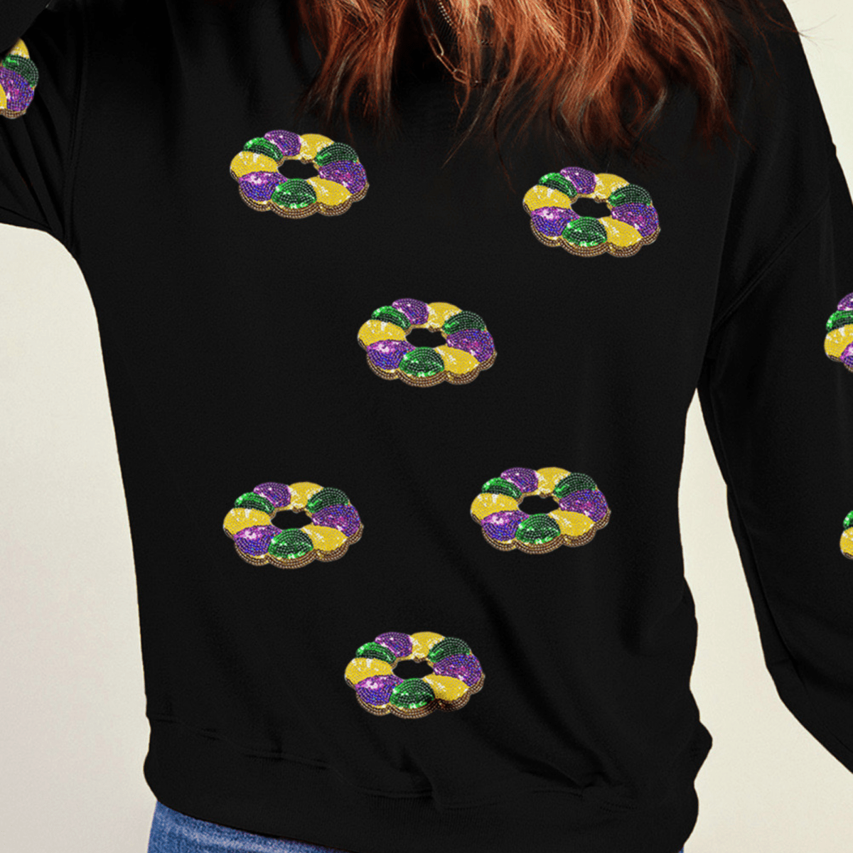 Step into the festive spirit with our Black Sequined Donuts of Mardi Gras Colors Drop Shoulder Sweatshirt! Designed for both comfort and style, this sweatshirt features dazzling sequin donuts in classic Mardi Gras colors—purple, green, and gold—making it the perfect statement piece for parades, parties, and casual celebrations. The drop-shoulder design adds a relaxed fit, while the soft fabric blend ensures cozy wear throughout the season.