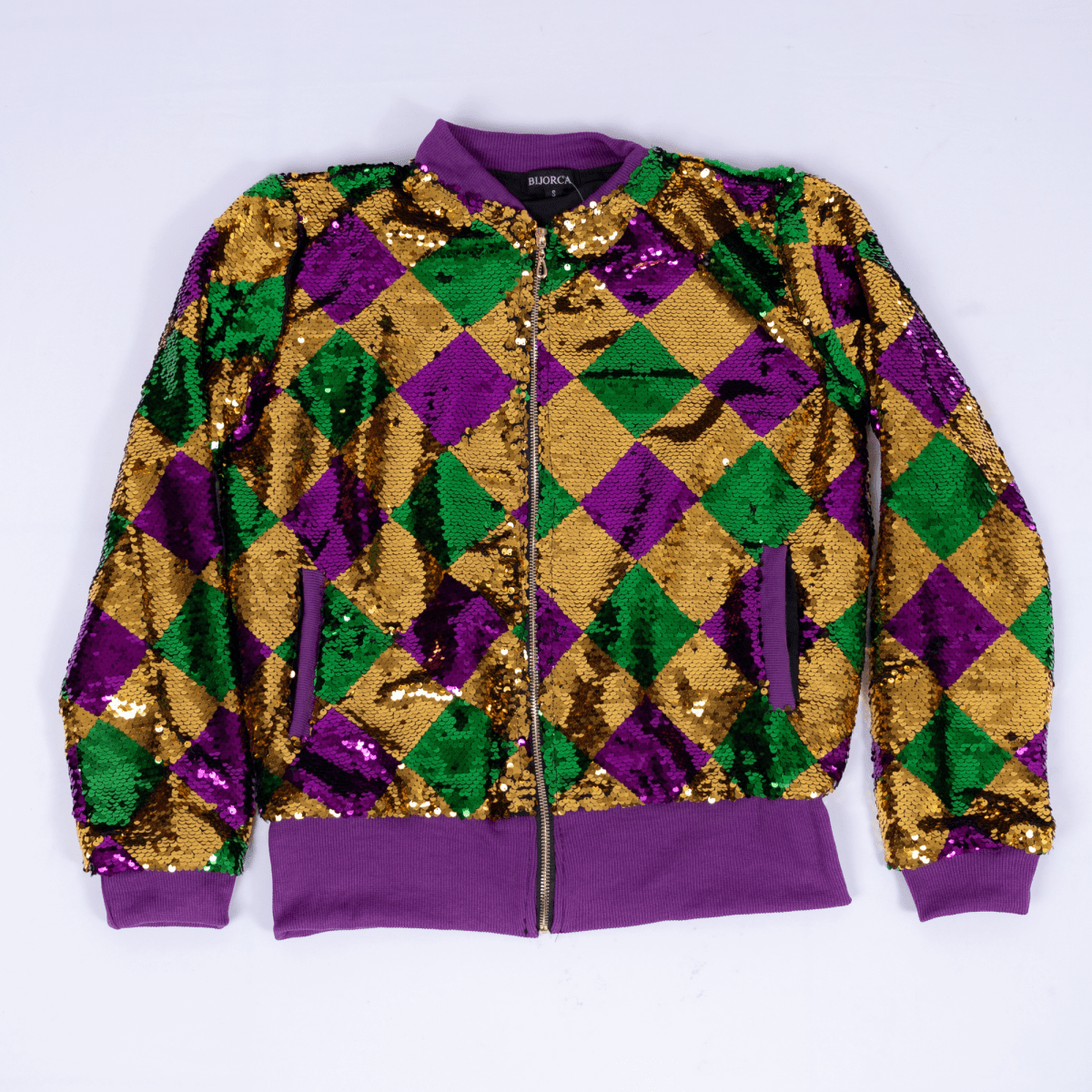 Order your Harlequin Sequin Mardi Gras Zip-Up Jacket today and celebrate in style!