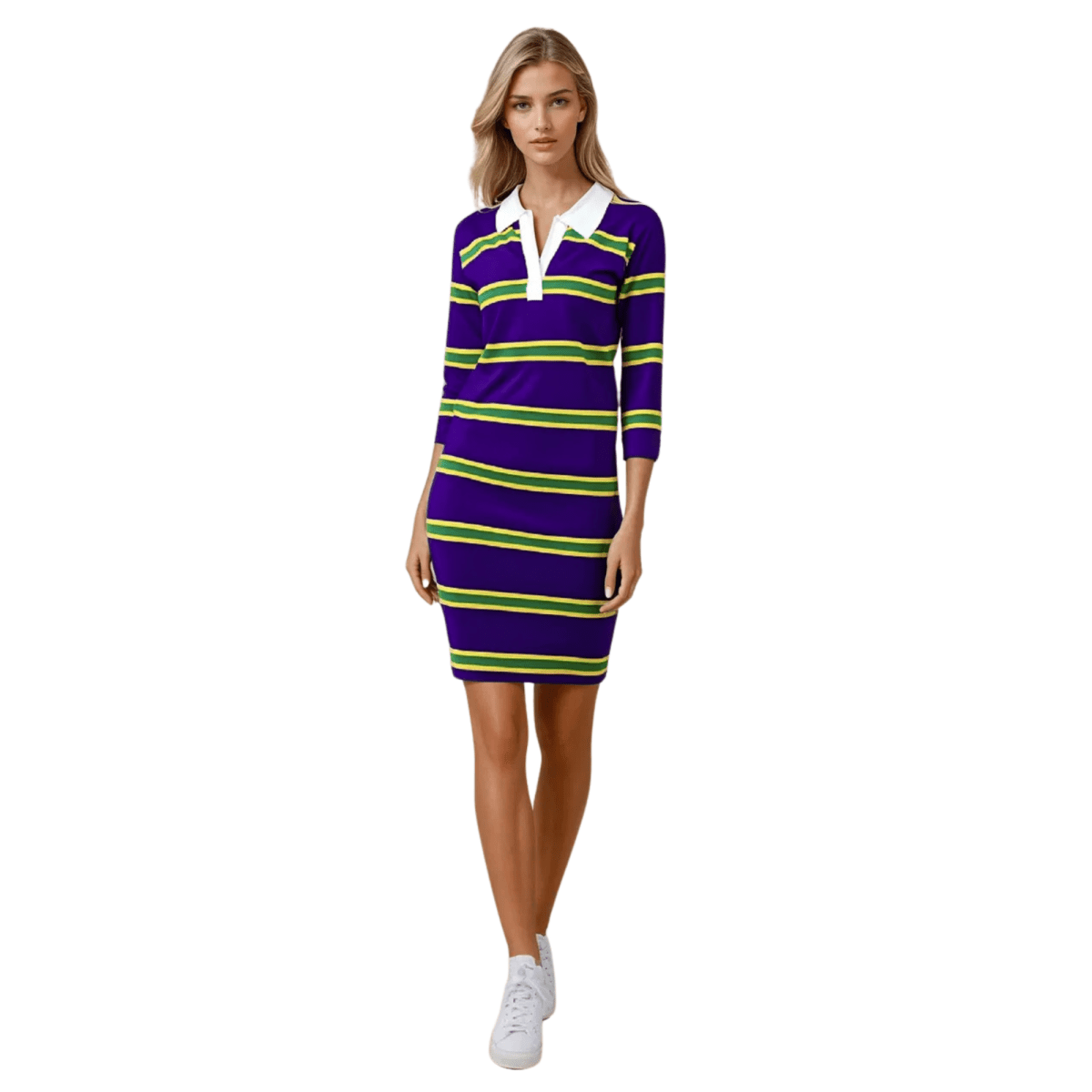 Our Adult Mardi Gras FLD Ladies Purple Dress with Yellow & Green Stripes, the epitome of Mardi Gras fashion for the upcoming Carnival season. This dress combines the iconic colors of Mardi Gras, and it's designed to make you stand out at any festive occasion, from parades to masquerade balls.