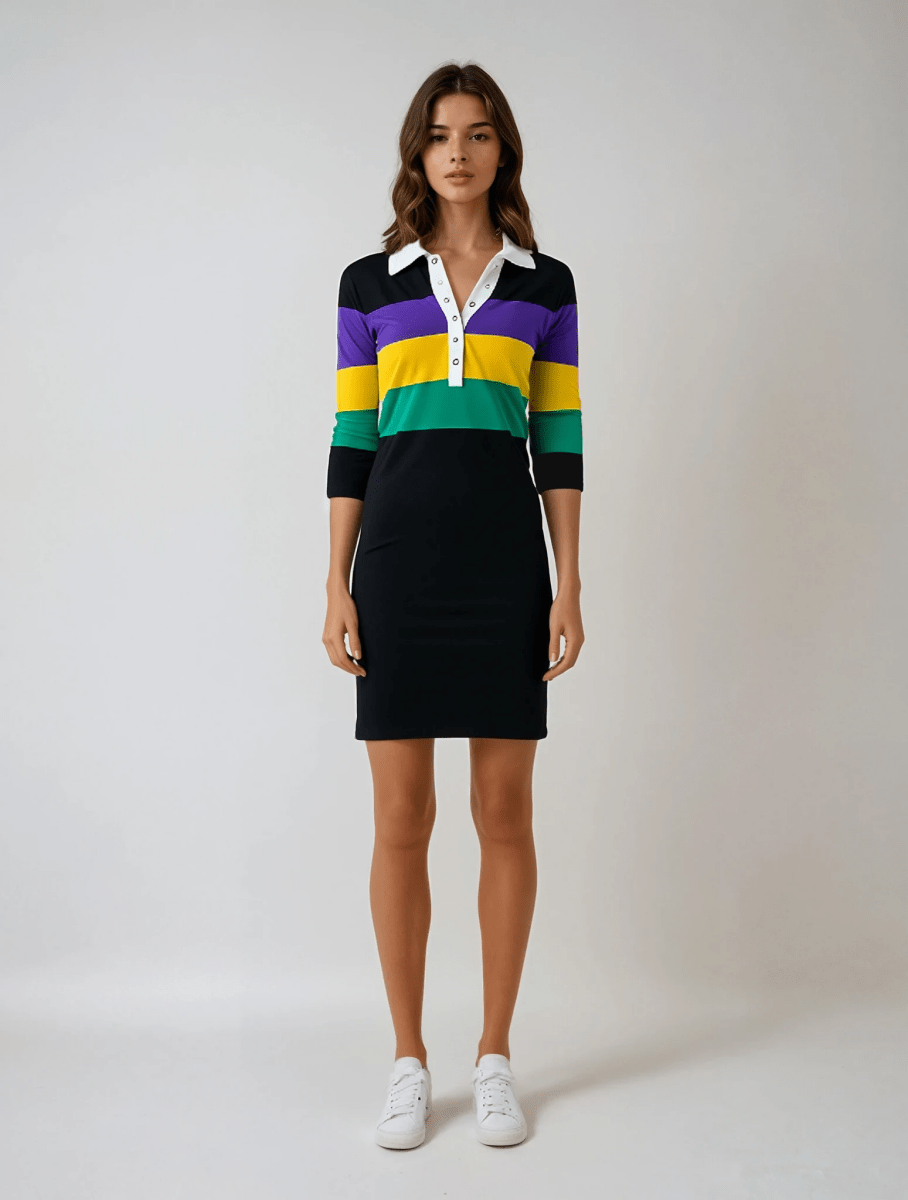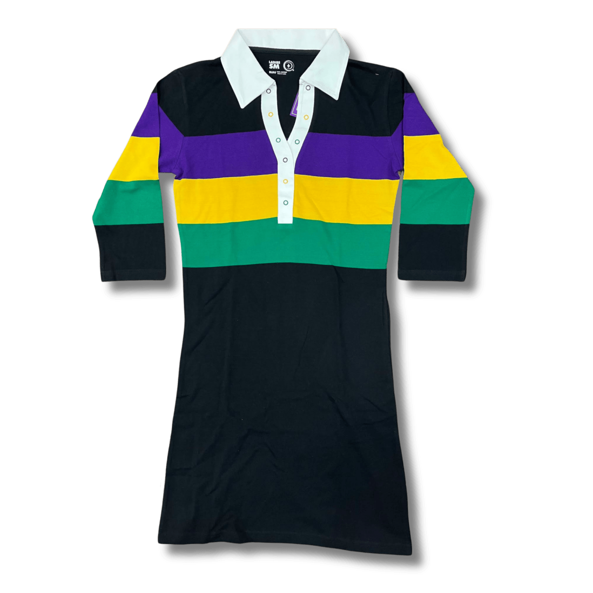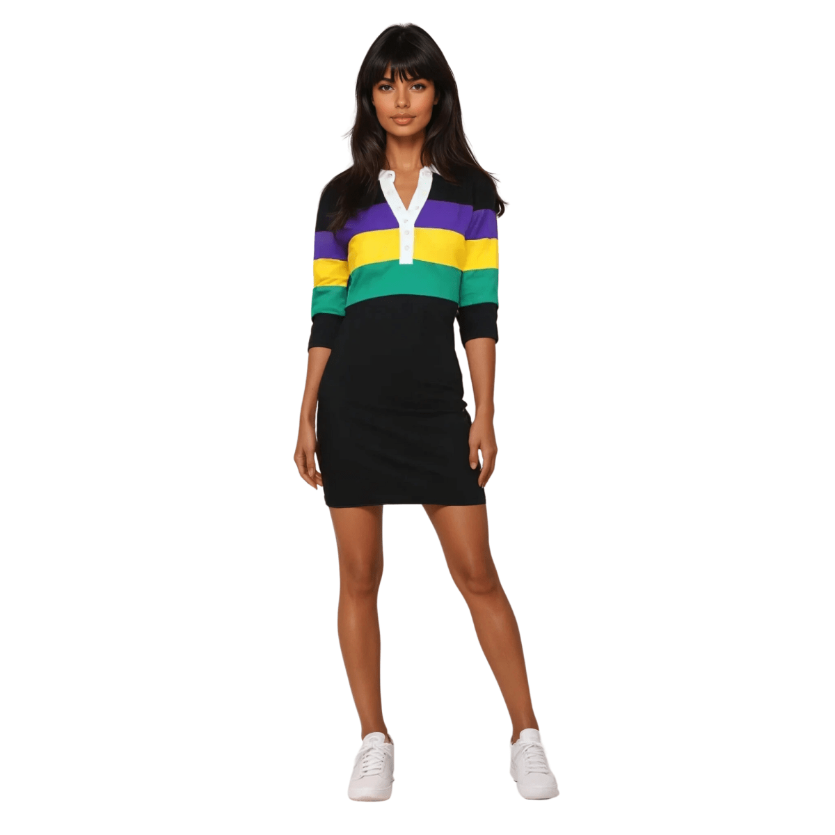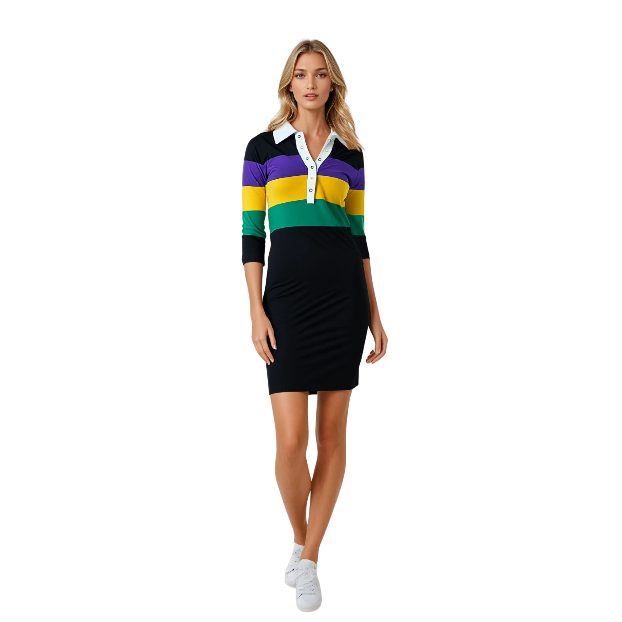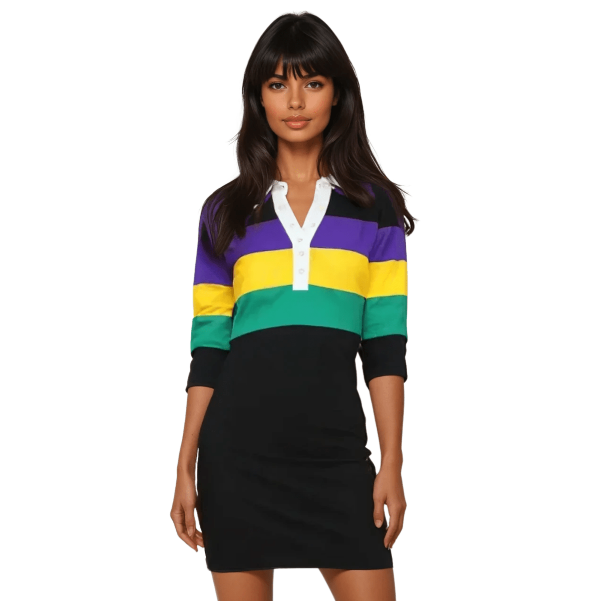 Step out in style this Mardi Gras season with the Adult Mardi Gras Rugby Polo Dress! Combining the bold colors of purple, green, and gold with a sleek and comfortable design, this dress is perfect for parades, parties, and casual outings. Featuring 3/4-length sleeves, a classic white collar, and a button-up placket with gold accents, this rugby-style dress offers a polished yet festive look.