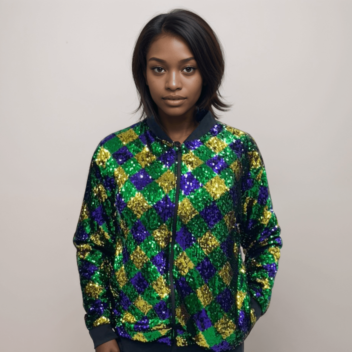 Make a bold statement and embrace the spirit of Mardi Gras with this vibrant sequin harlequin jacket!
