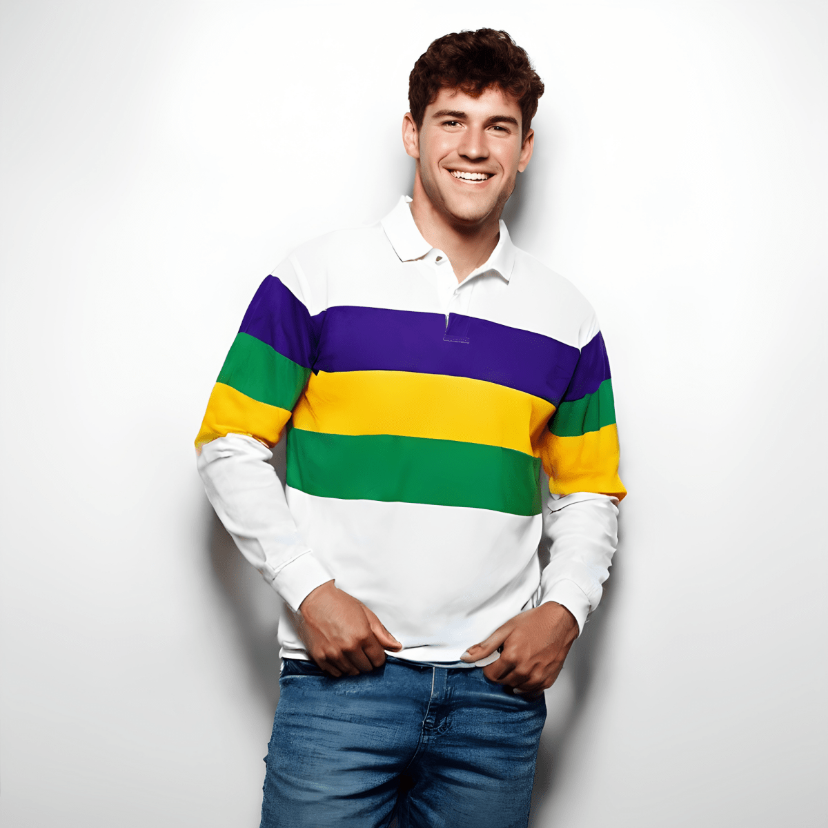Distinctive Design: Stand out from the crowd with the eye-catching 3-panel design that features Mardi Gras colors – purple, green, and gold. The unique combination of traditional rugby styling and festive Mardi Gras elements makes this polo a statement piece.