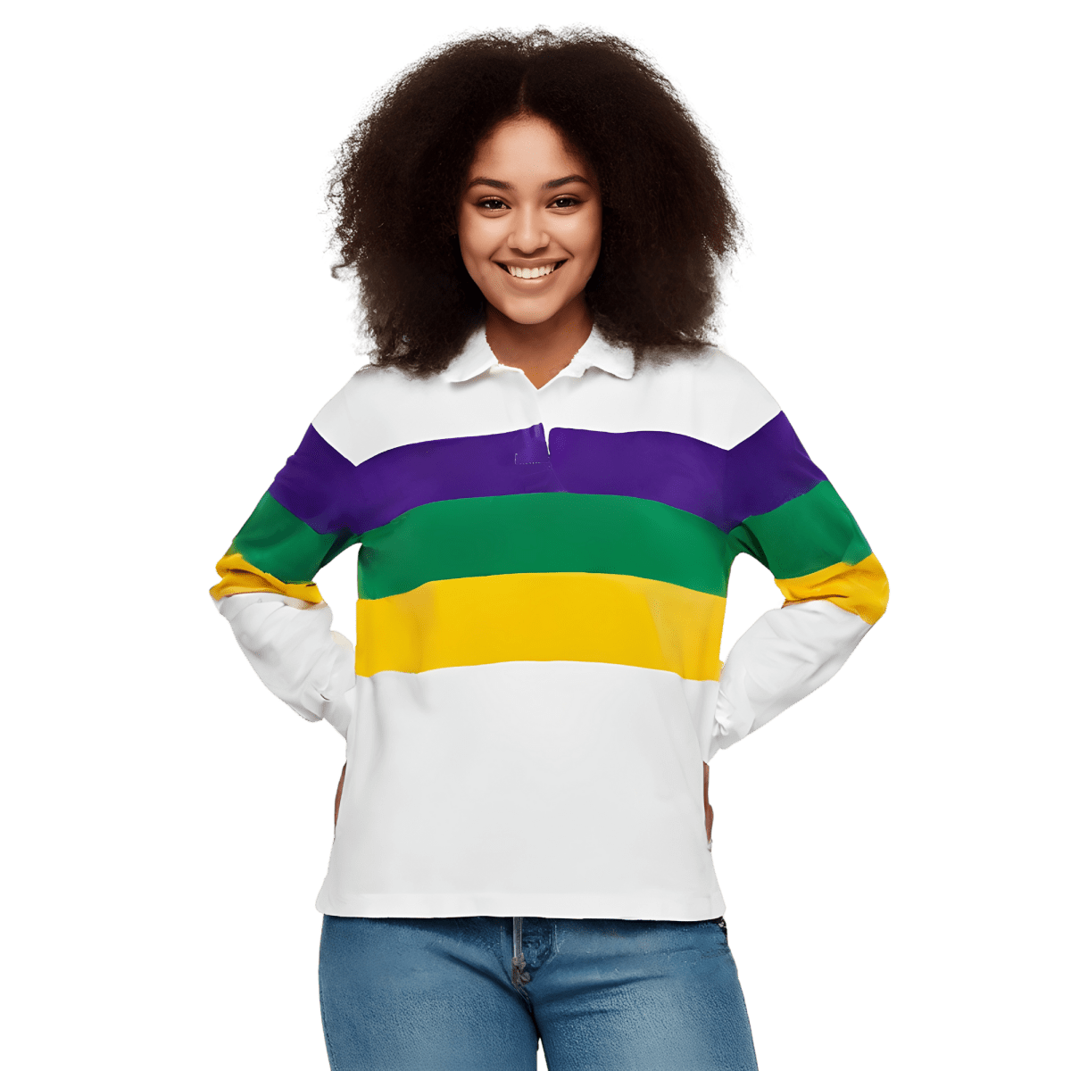 Elevate your Mardi Gras style with our Adult Mardi Gras Unisex 3 Panel Long Sleeve Rugby Polo in striking white. This uniquely designed polo combines the classic charm of a rugby shirt with the vibrant spirit of Mardi Gras, making it the perfect choice for those who want to celebrate in comfort and style.