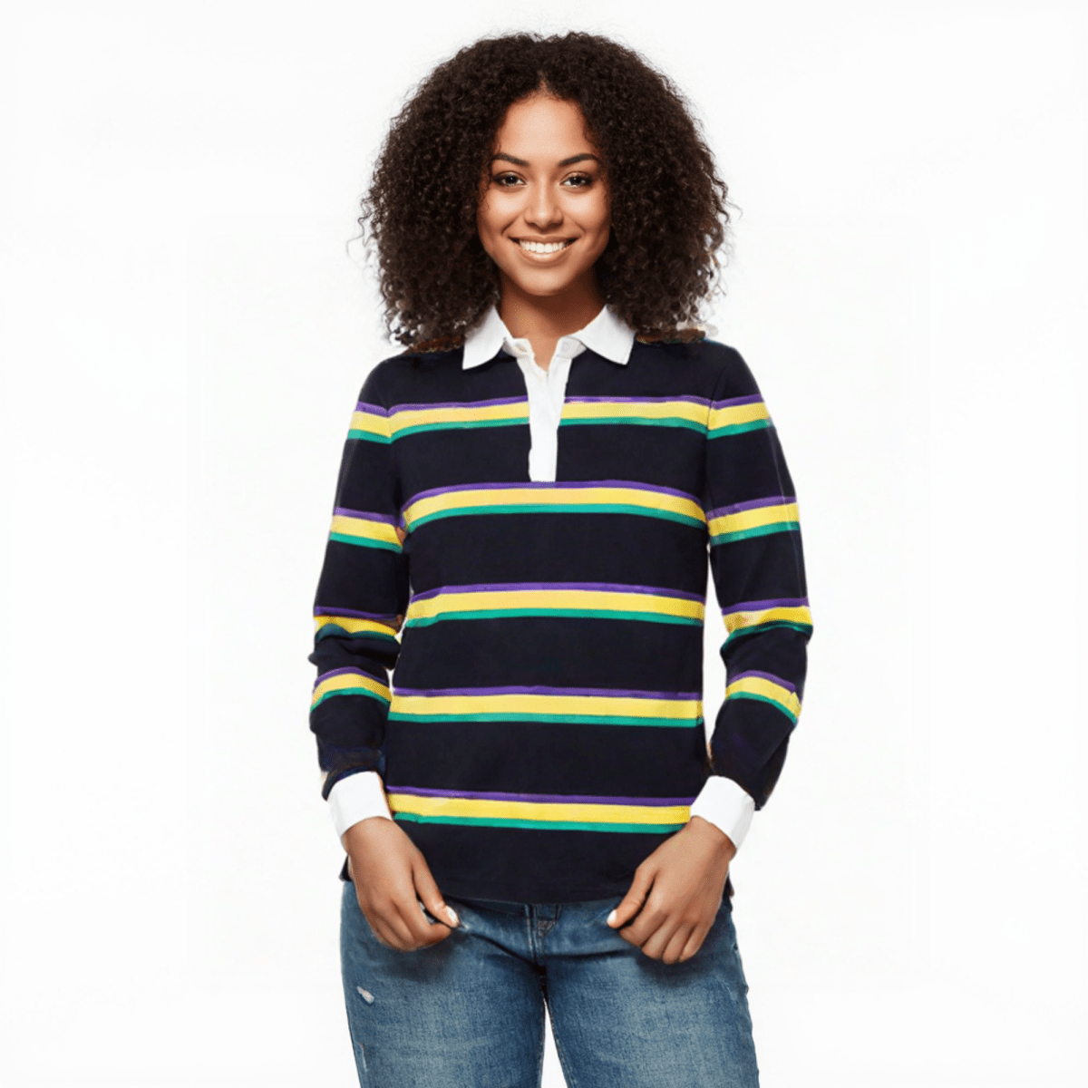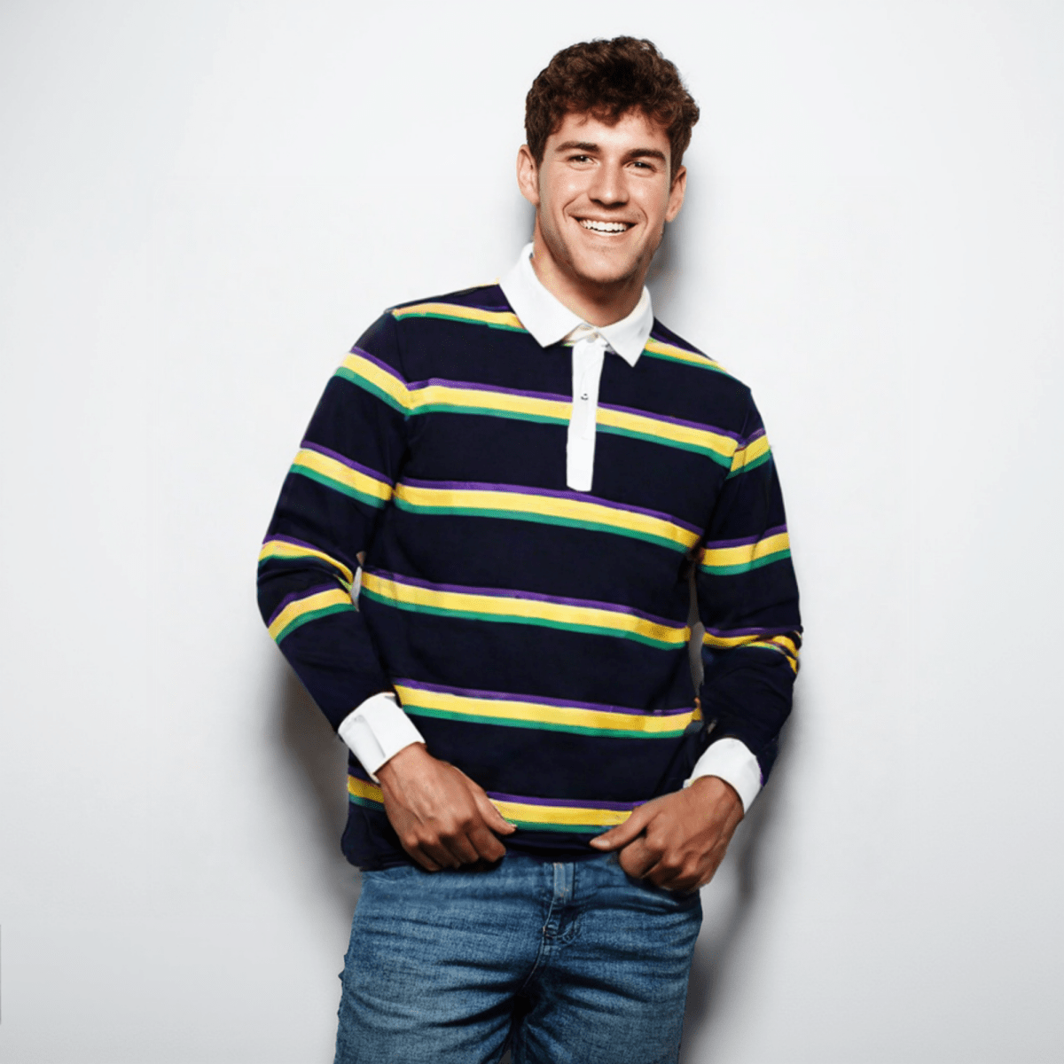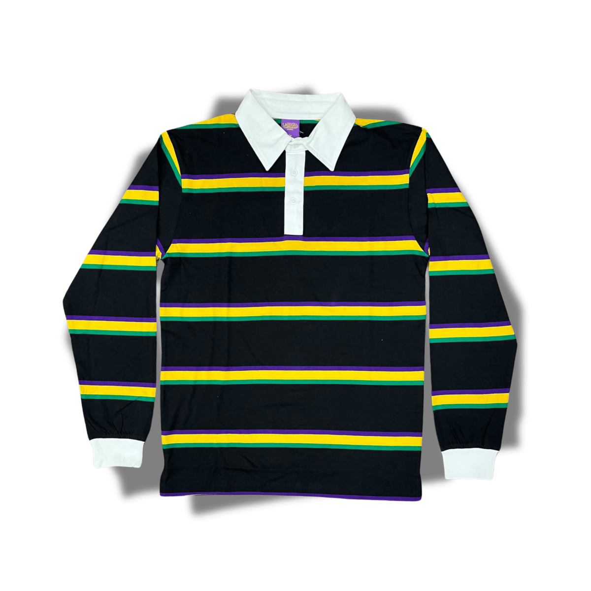 Get ready for Mardi Gras in style with this Unisex Striped Rugby Long Sleeve Polo! Available in adult sizes: SM, MD, LG, and XL. Order now to celebrate in comfort and elegance!