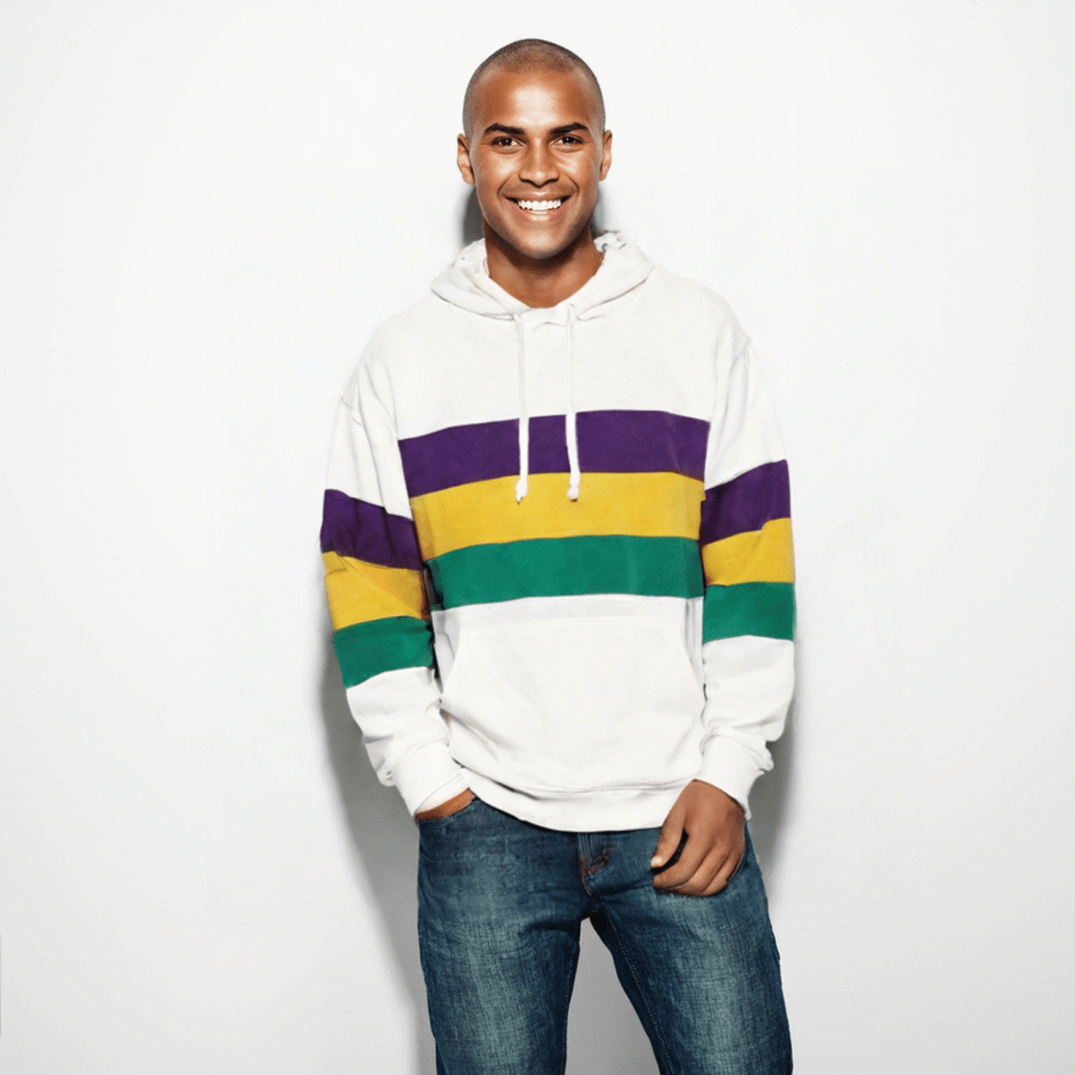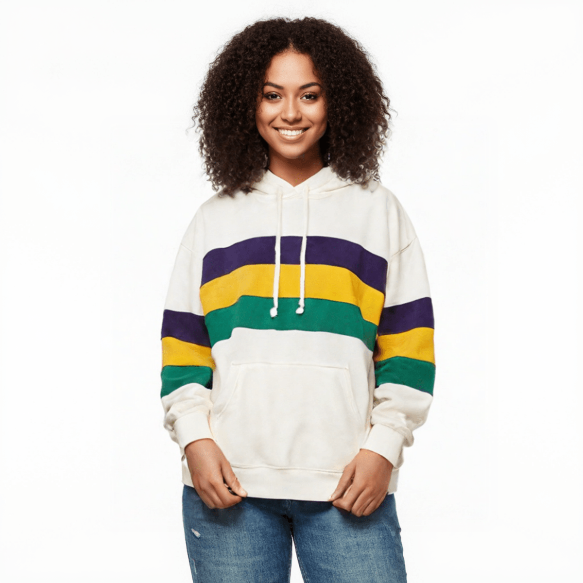 Elevate your Mardi Gras wardrobe with the Adult Unisex Mardi Gras Striped Pullover White Hoodie, a stylish and functional addition to your festive attire. Featuring striking purple, green, and gold stripes on a crisp white background, this hoodie ensures you stand out in any crowd. Made from 100% polyester, it provides a perfect combination of comfort and durability, ideal for Mardi Gras celebrations.
