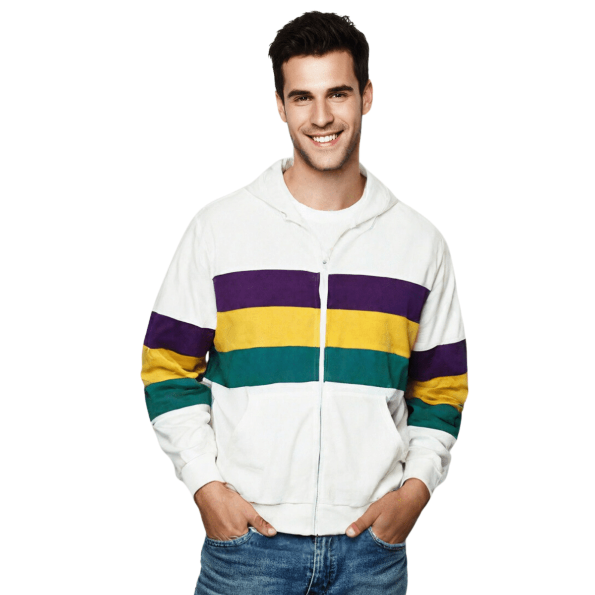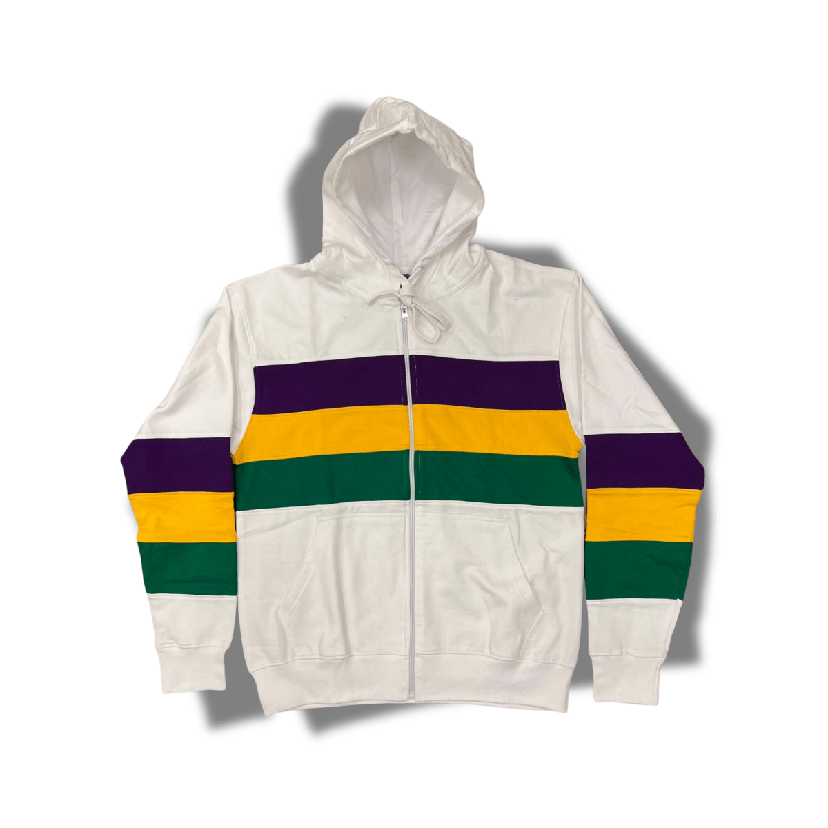 Adult Mardi Gras White Hoodie with Zipper - Unisex Purple, Green & Gold Striped Design