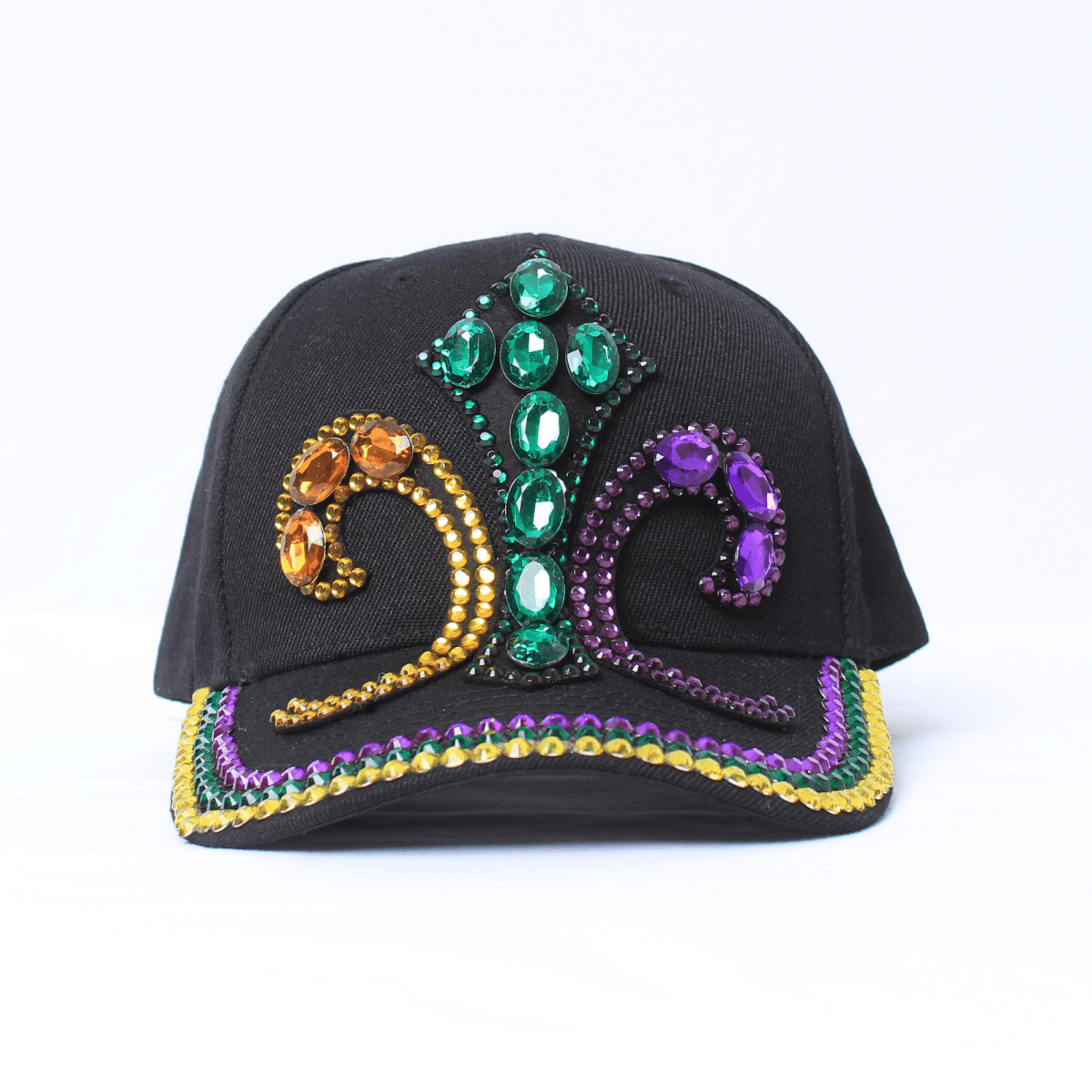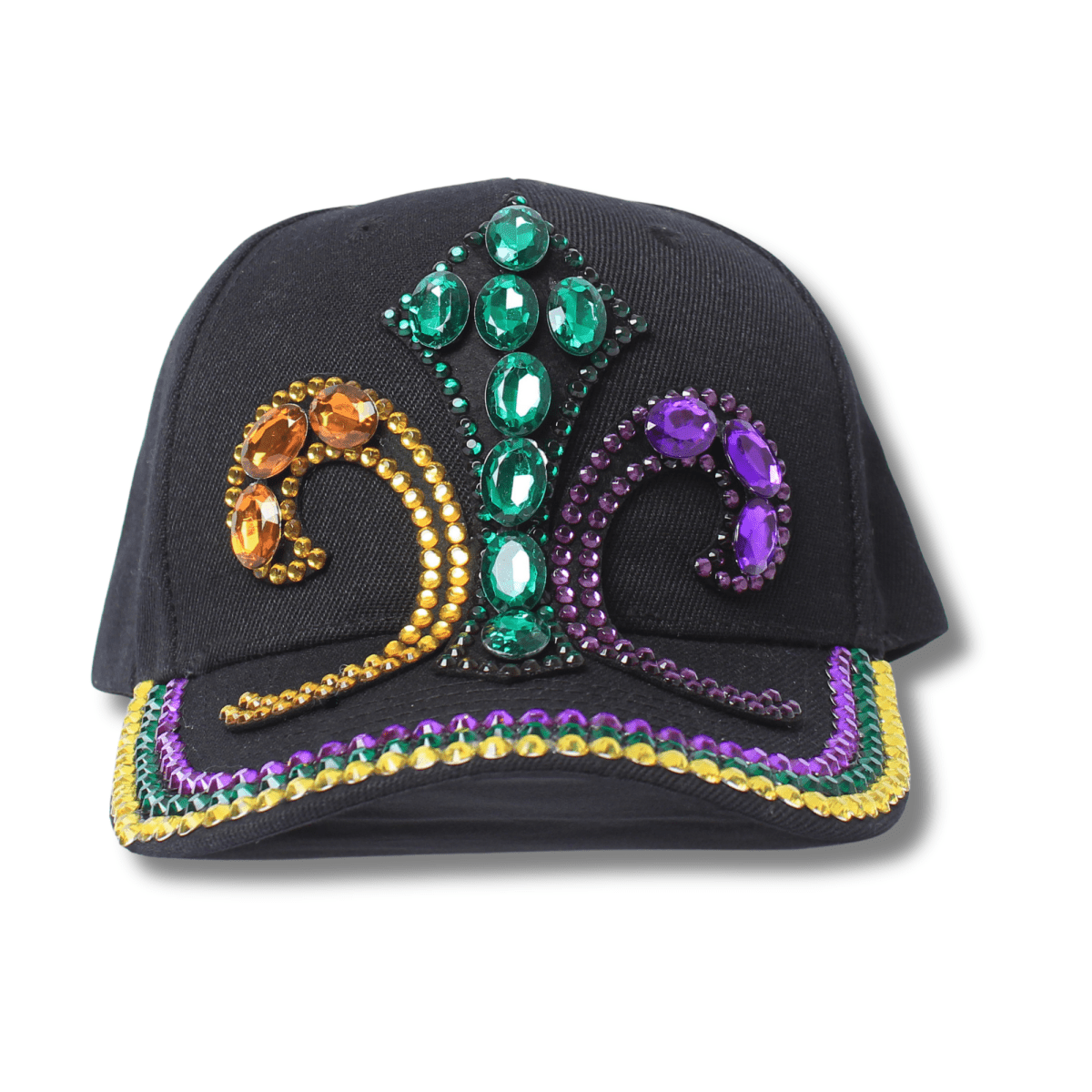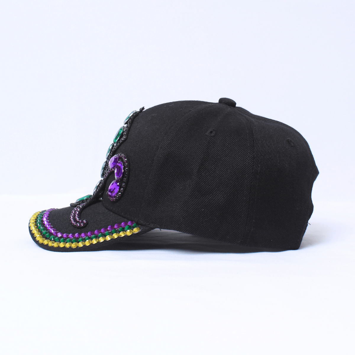 Elevate your Mardi Gras look with this stunning black rhinestone baseball hat featuring a sparkling Fleur-de-Lis design. Perfect for celebrating in style, this cap boasts vibrant green, purple, and gold stones that shimmer with every move. The brim is adorned with matching rhinestones for an extra festive touch, making it an eye-catching accessory for parades, parties, and Mardi Gras festivities.