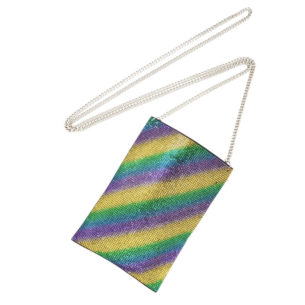 Add a touch of sparkle to your Mardi Gras celebrations with this vibrant Bling Rhinestone Mardi Gras Crossbody Cell Phone ID Holder. Adorned with shimmering rhinestones in classic Mardi Gras colors—purple, green, and gold—this stylish crossbody bag is perfect for keeping your essentials close while you're out enjoying the festivities. The sleek design features a silver chain strap, a clear ID holder on the back for easy access, and enough space to securely hold your phone, ID, and a few small items. This functional yet fashionable accessory is ideal for parades, parties, and Mardi Gras-themed events, allowing you to keep your hands free while showcasing your Mardi Gras spirit.