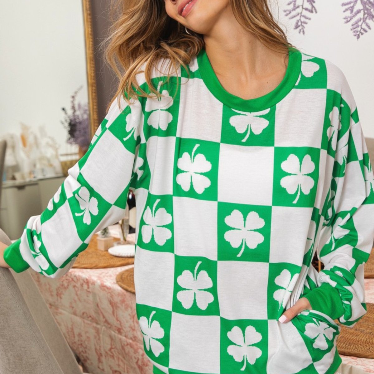 Embrace the spirit of the Emerald Isle with this vibrant and cozy long-sleeve top. Perfect for those who want to celebrate their Irish heritage, partake in St. Patrick's Day festivities, or simply add a pop of playful pattern to their wardrobe. The top features a bold green and white checkered design, interspersed with lucky four-leaf clovers that promise to bring a touch of magic to your day.