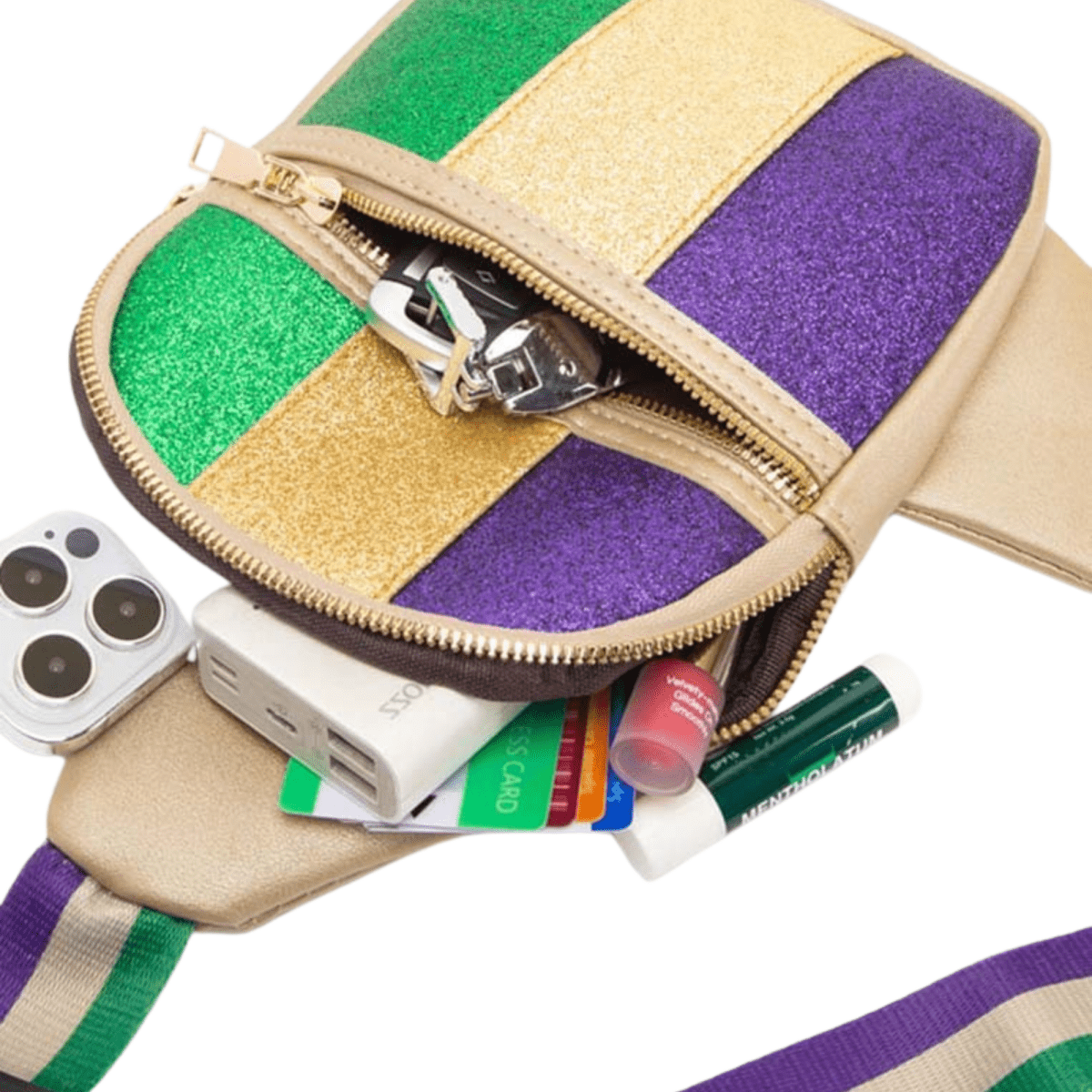 Elevate your Mardi Gras outfit with this dazzling sling bag that perfectly captures the festive spirit. Designed with a vibrant sparkle front in classic Mardi Gras colors – purple, gold, and green – this bag is a must-have accessory for parade-goers and party enthusiasts alike.