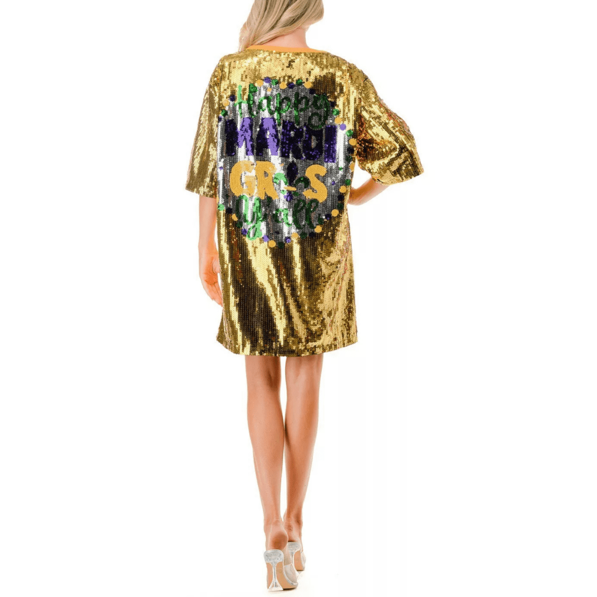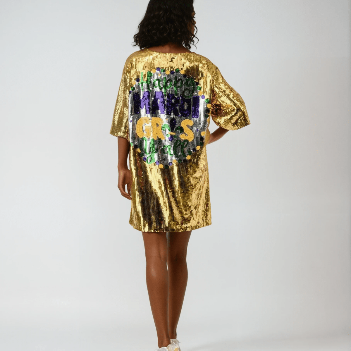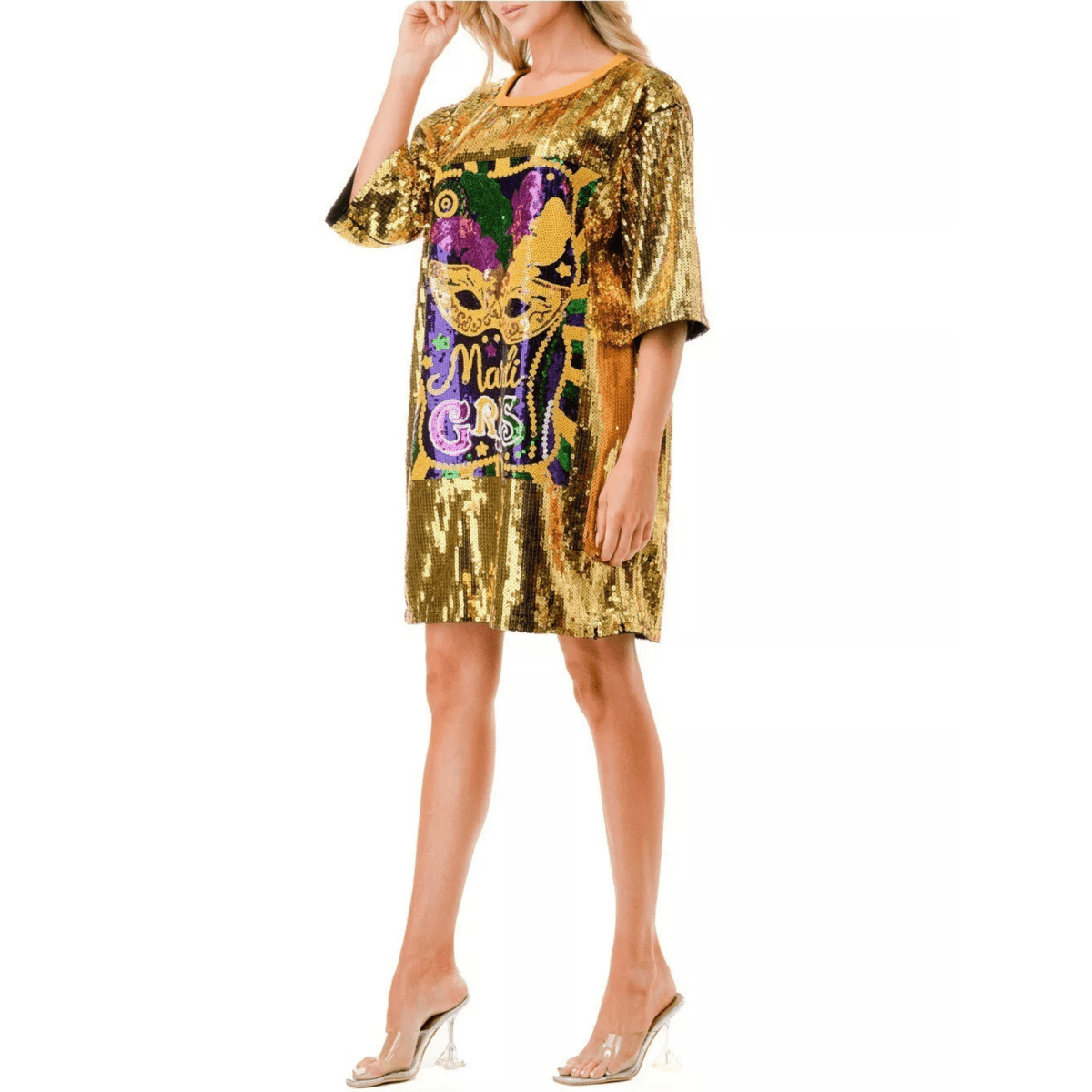 Celebrate Mardi Gras in style! Order your Mardi Gras Gold Mask Sequin Dress today and dazzle at every event.