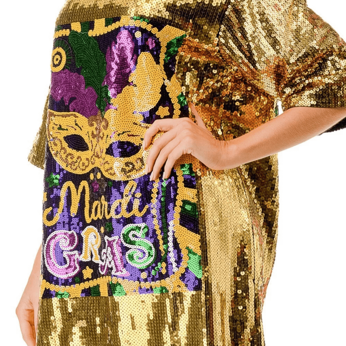 Make a grand entrance this Mardi Gras with the Mardi Gras Gold Mask Sequin Dress. Covered in dazzling gold sequins and adorned with a vibrant festive mask design, this dress is the perfect choice for parades, parties, and celebrations. Designed in iconic Mardi Gras colors—purple, green, and gold—it offers both comfort and style. With its lightweight fabric and flattering one-size-fits-most design, you'll be ready to celebrate in ultimate flair.