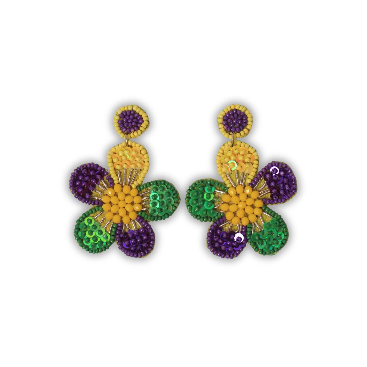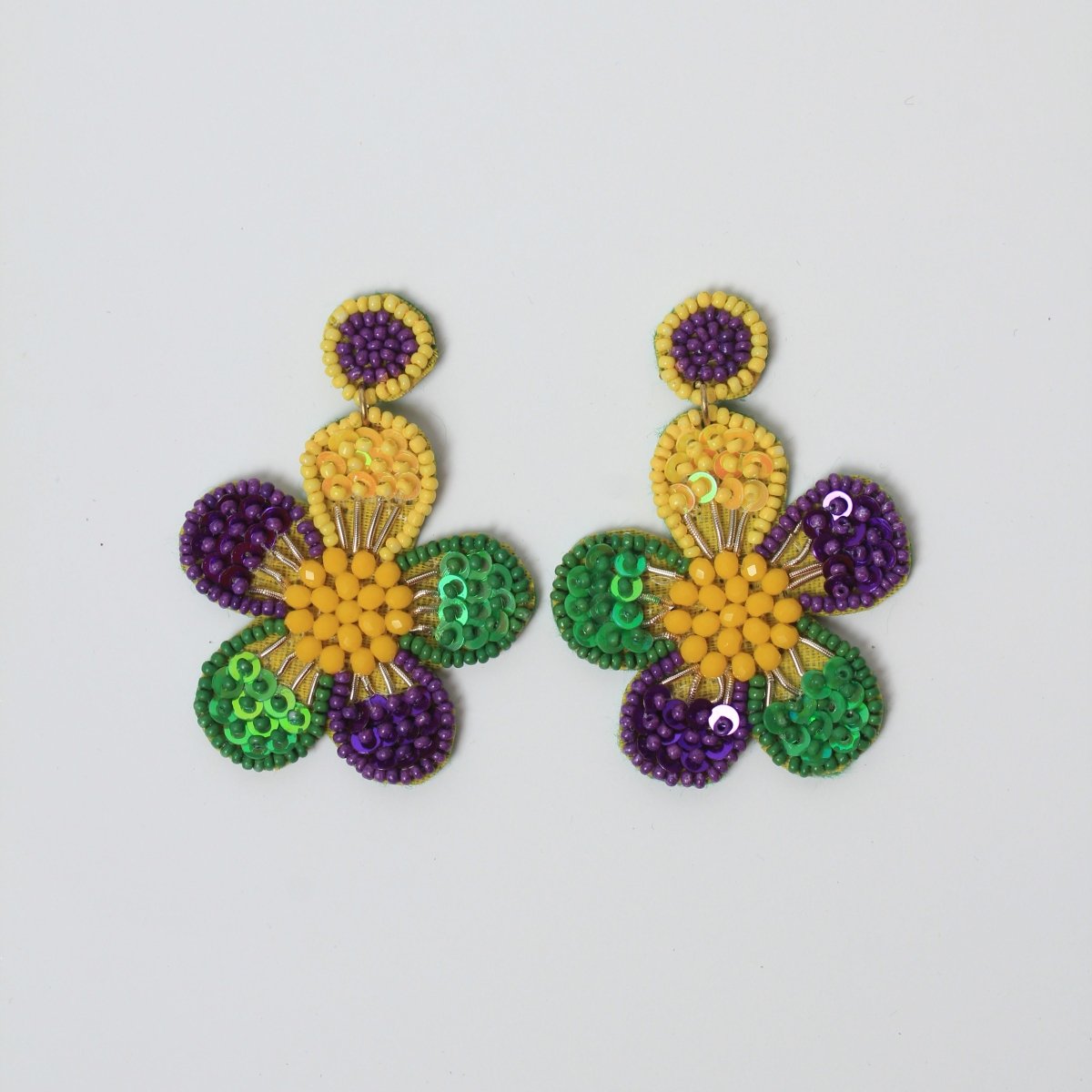 Bloom in festive style with these Floral Beaded Mardi Gras Earrings! Featuring a beautiful flower-shaped design, these earrings are intricately crafted with beads and sequins in the vibrant Mardi Gras colors of purple, green, and gold. Lightweight yet eye-catching, these earrings add a playful and elegant touch to any Mardi Gras outfit. Perfect for parades, parties, or themed events, the secure backing ensures comfort throughout the day. Let your Mardi Gras spirit shine with these statement floral earrings!