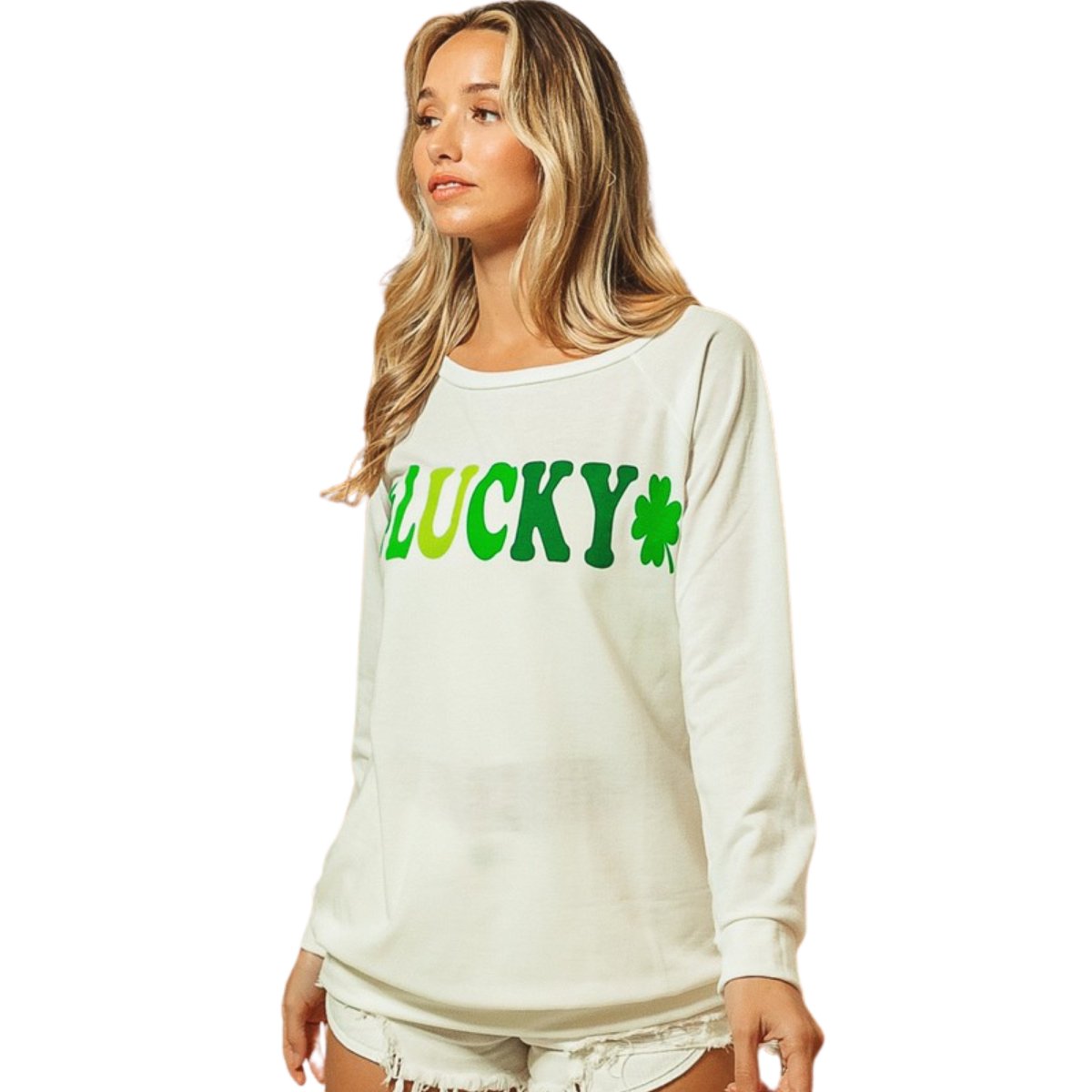 Find your festive side with our #LUCKY Clover Graphic Pullover, a delightful addition to your casual wear that brings both comfort and cheer. Made from a soft French terry knit, this top is designed to keep you cozy whether you're out celebrating or enjoying a laid-back day at home.