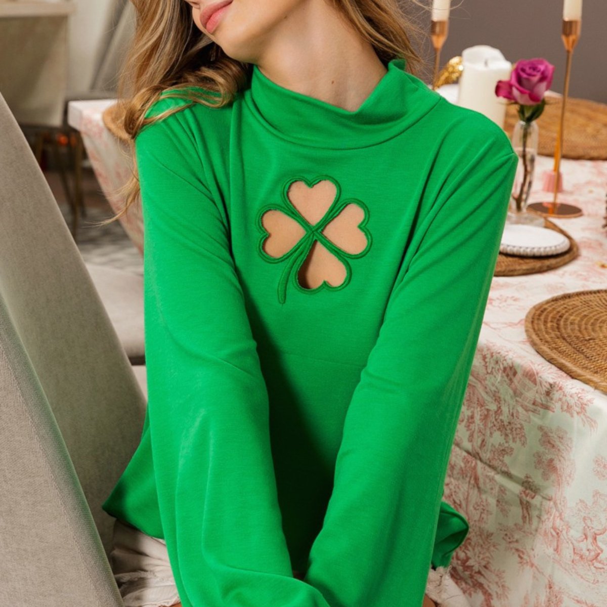 Whether you're heading to a festive event or just looking to brighten up your day-to-day attire, our Lucky Charm Cut-Out Mock Neck Top is sure to bring you compliments and perhaps even a little bit of good fortune.