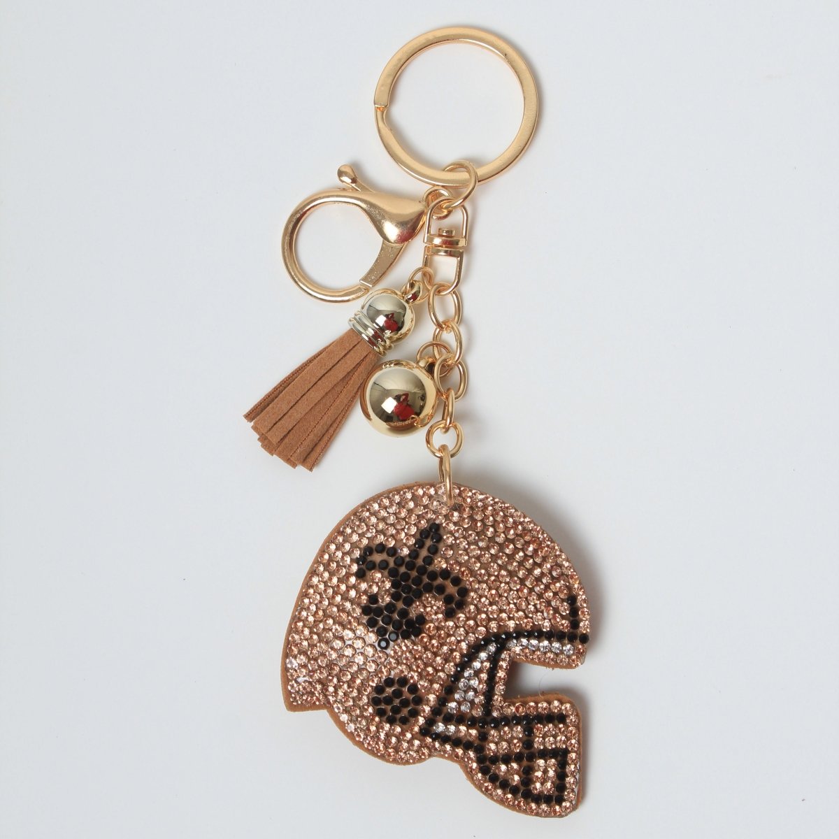 Show off your team spirit with this dazzling Gold Football Helmet Rhinestone Keychain. Featuring a football helmet encrusted with sparkling rhinestones and a black fleur-de-lis design, this keychain is a perfect accessory for football fans. It includes a gold-tone key ring and a tan tassel for added flair, making it ideal for organizing keys or decorating your bag. Whether you're heading to a game or just want to support your team, this keychain is the perfect way to add a bit of shine to your daily essentials.