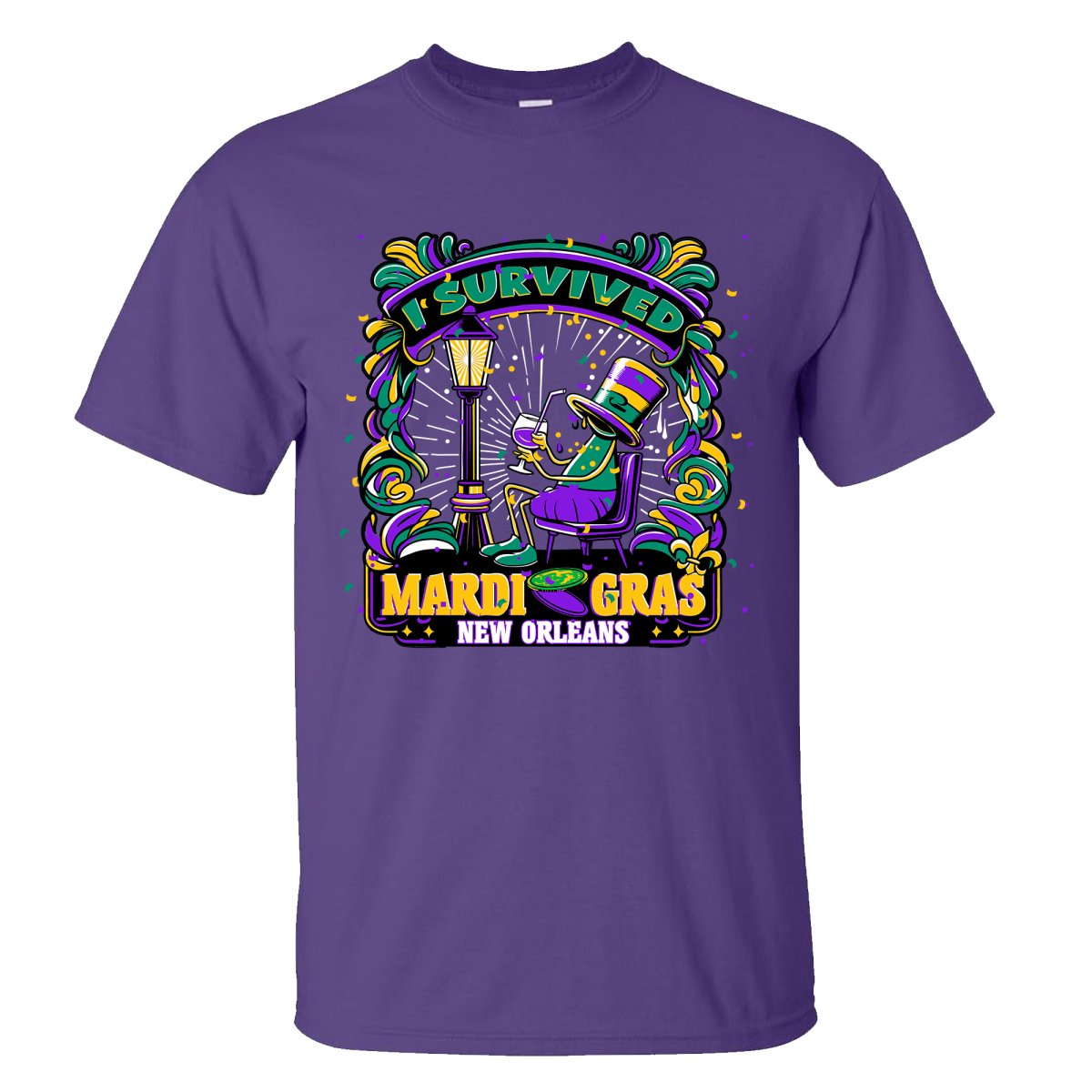 Showcase your enduring spirit with the "I Survived Mardi Gras - New Orleans" T-shirt in regal purple. This vivid tee celebrates the fun and folly of Mardi Gras with a playful graphic that's sure to spark conversations and commemorate your experience in the heart of the festivities.