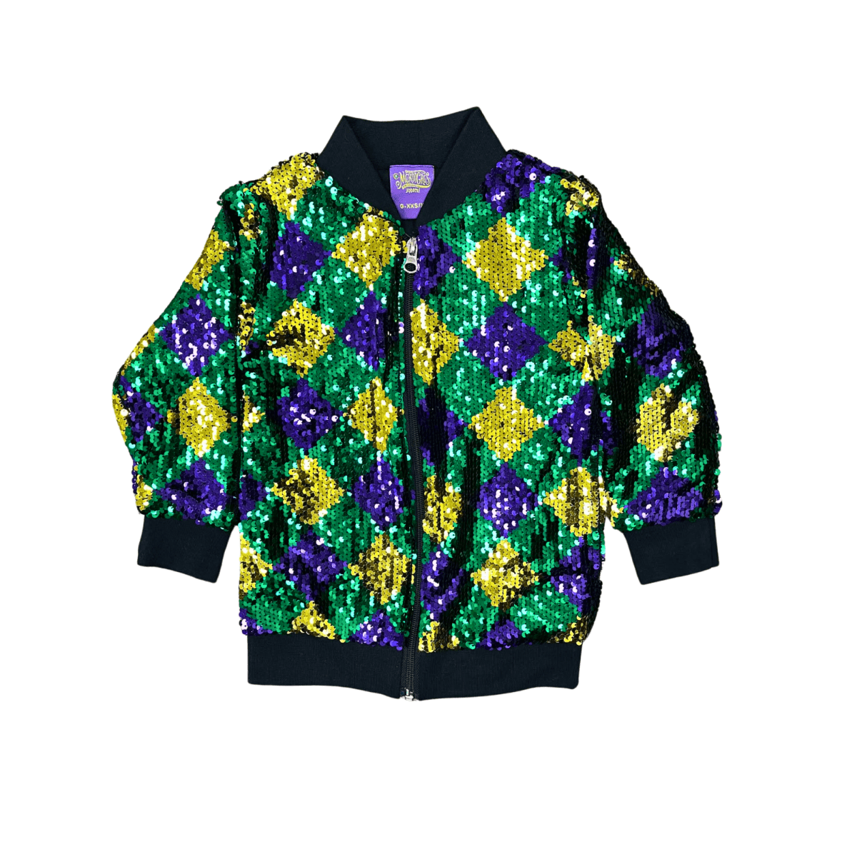 Make every moment sparkle with the Kids Mardi Gras Sequin Bomber Jacket! Designed with a bold harlequin sequin pattern in traditional Mardi Gras colors, this jacket is perfect for celebrating the season in style. The ribbed cuffs, hem, and collar provide a comfortable fit, while the full-zip front closure makes it easy to wear. Whether for parades, parties, or casual festive wear, this lightweight jacket will keep your child looking stylish and feeling great.