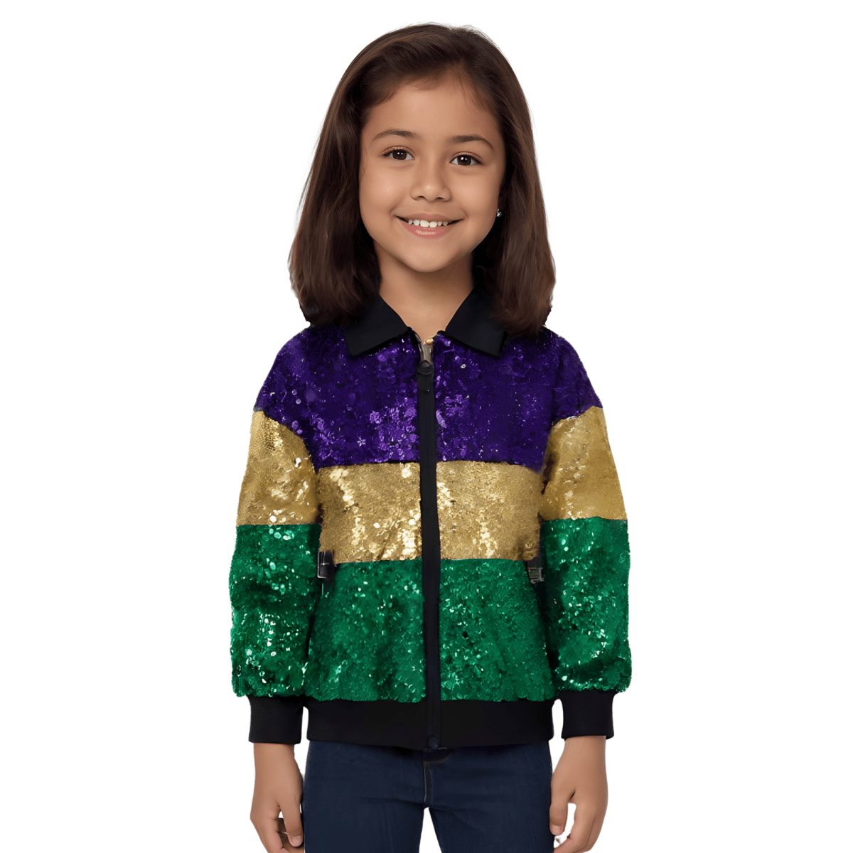 Let your child shine in this dazzling Mardi Gras jacket—perfect for celebrations, parades, and unforgettable memories!