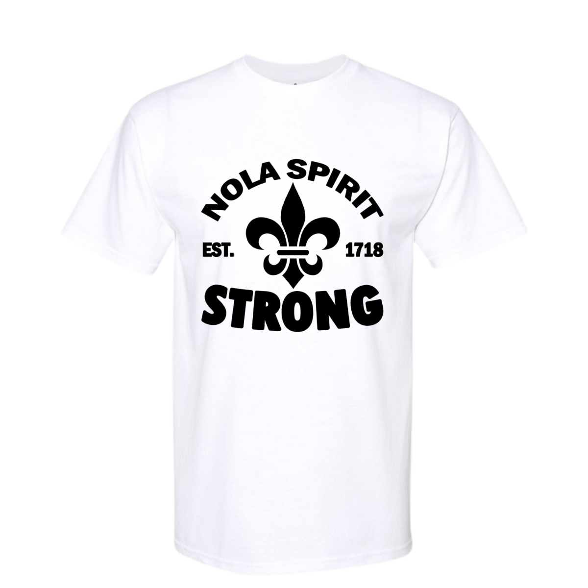 Show your support for New Orleans with the "NOLA Spirit Strong" t-shirt. This shirt represents unity, resilience, and hope for our beloved city.