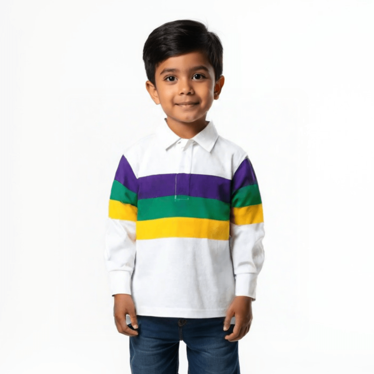 Kids Unisex 3 Panel Long Sleeve Mardi Gras Rugby Polo White