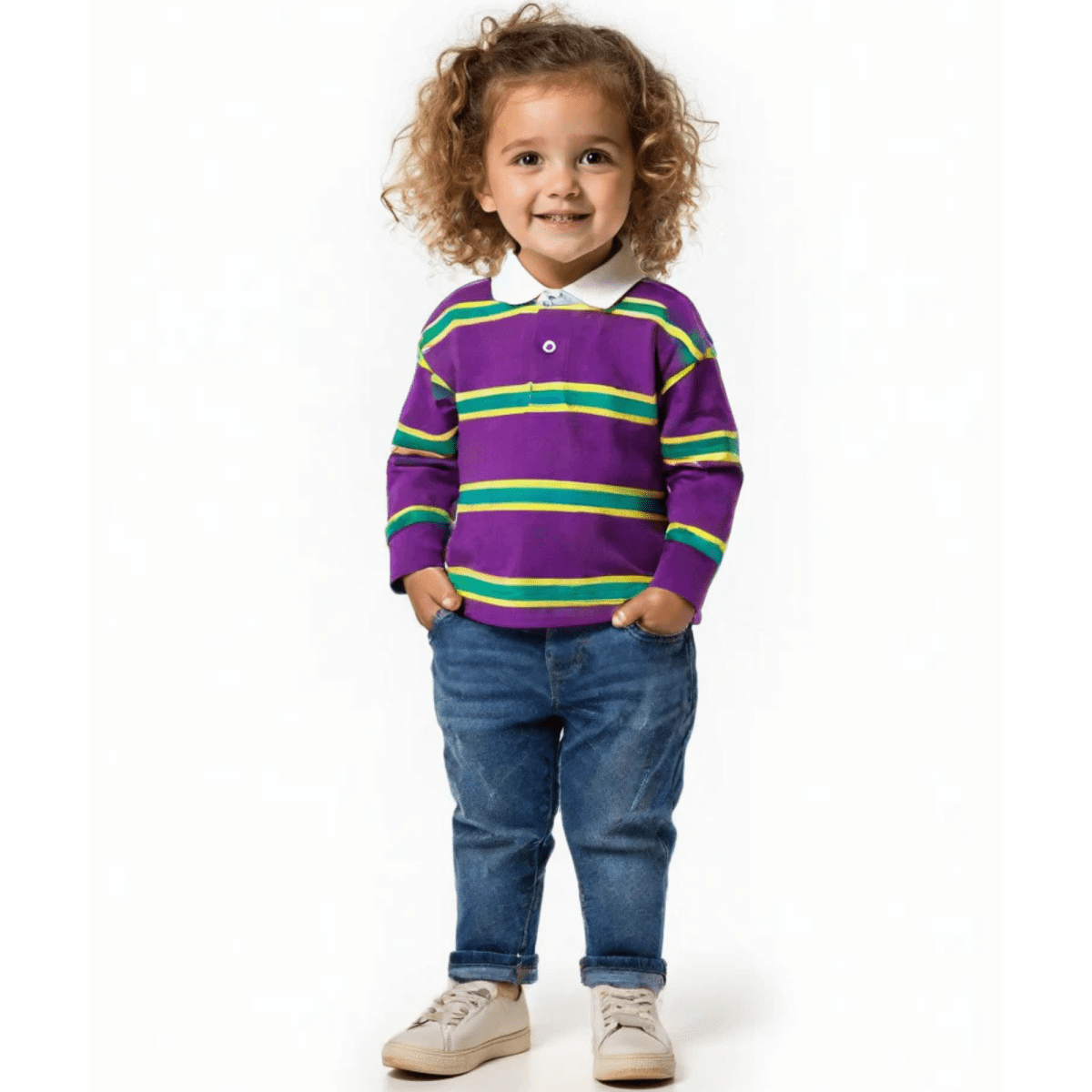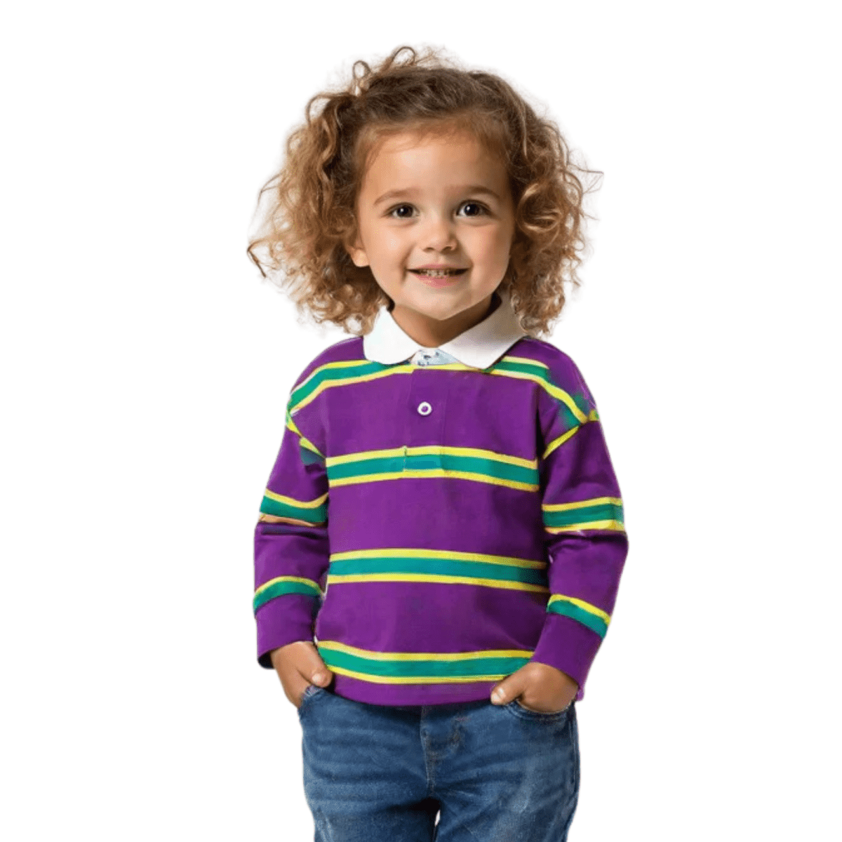 Kids Unisex Mardi Gras Purple Body with stripes 3 Panel Long Sleeve Rugby Polo