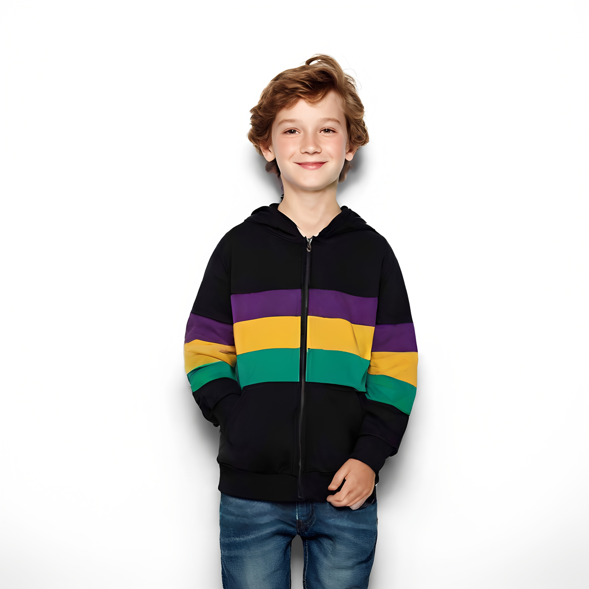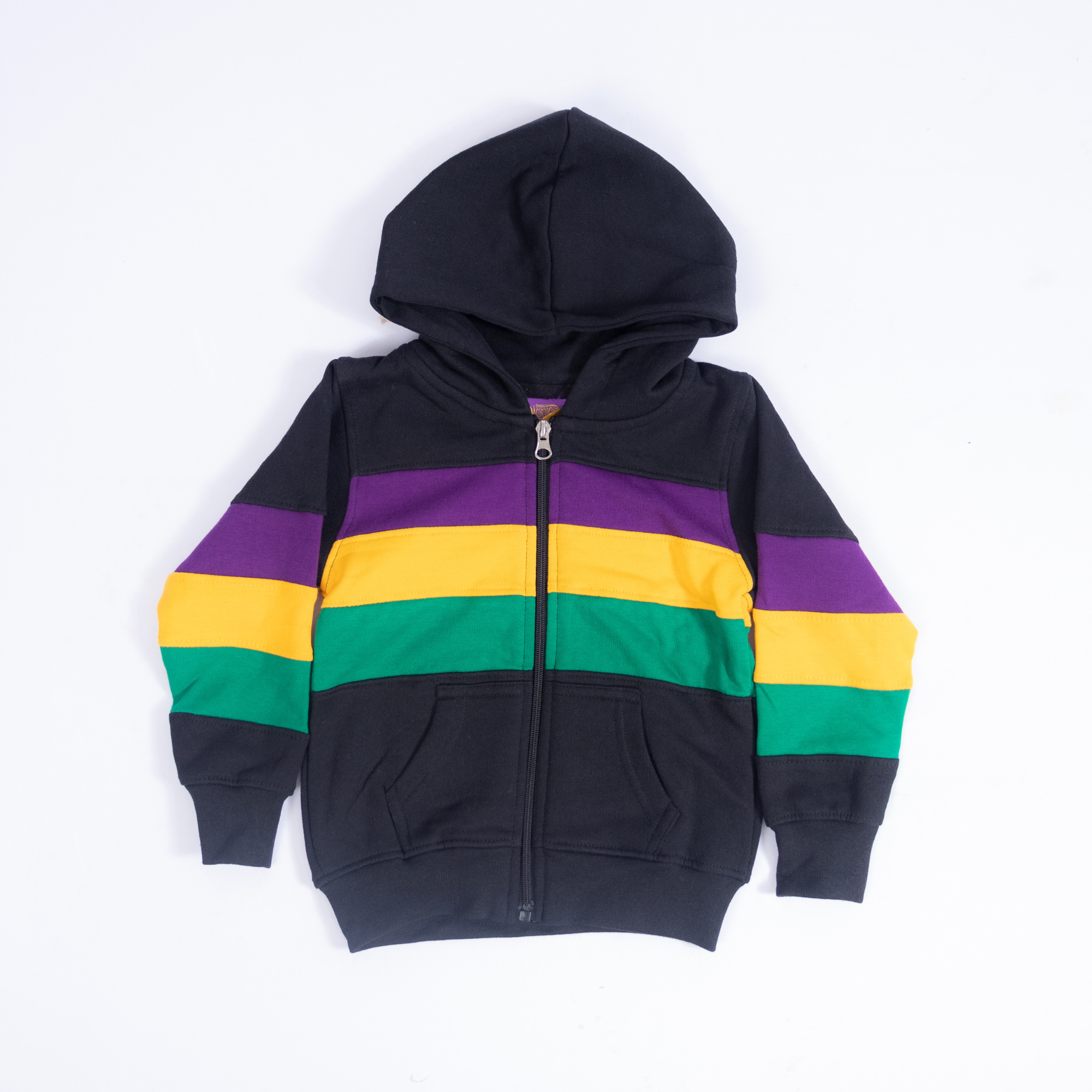 Kids Mardi Gras Zipper Hoodie - Black with Purple, Green, & Gold Stripes