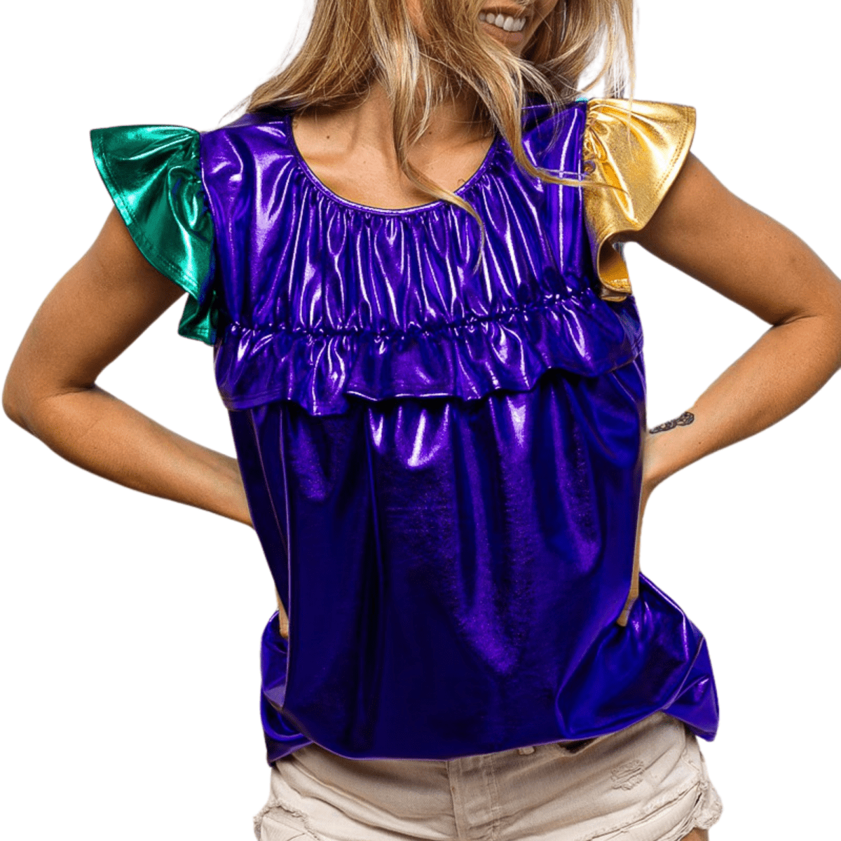 Upgrade your Mardi Gras look with this Foiled Knit Ruffled Color Block Top. Featuring a vibrant purple body with gold and green flutter sleeves, this stylish top is a must-have for festive celebrations. The shimmering foiled knit fabric adds an eye-catching metallic sheen, while the ruffled round neckline creates a flattering silhouette. Designed for comfort and elegance, this top is lightweight, breathable, and perfect for all-day wear.