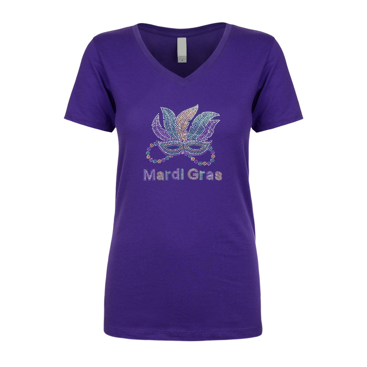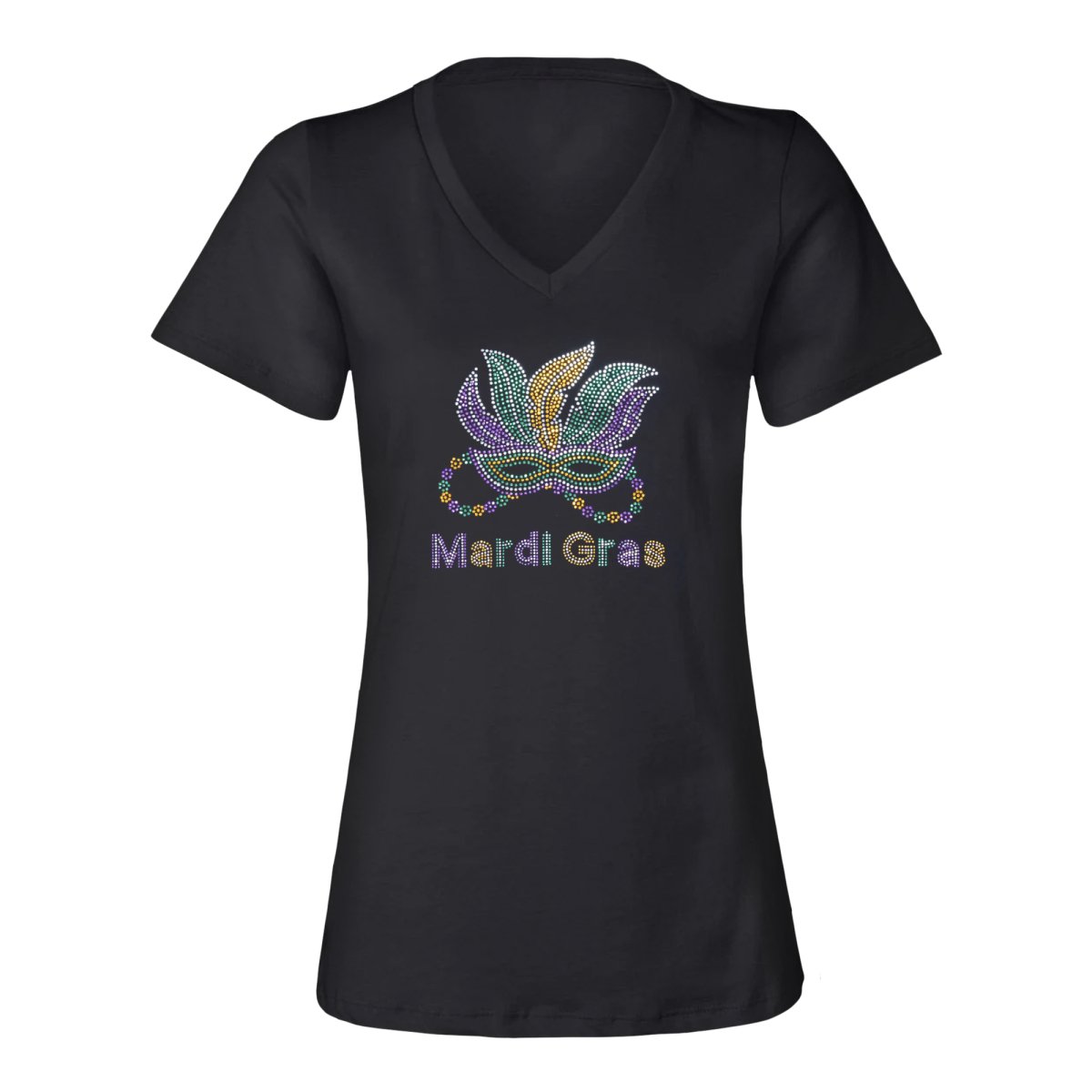 Step into the grandeur of Mardi Gras with our Ladies Gold Fleur De Lis and Mask Rhinestone V-Neck Tee-shirt. Order now and let your festive spirit shine with regal elegance!