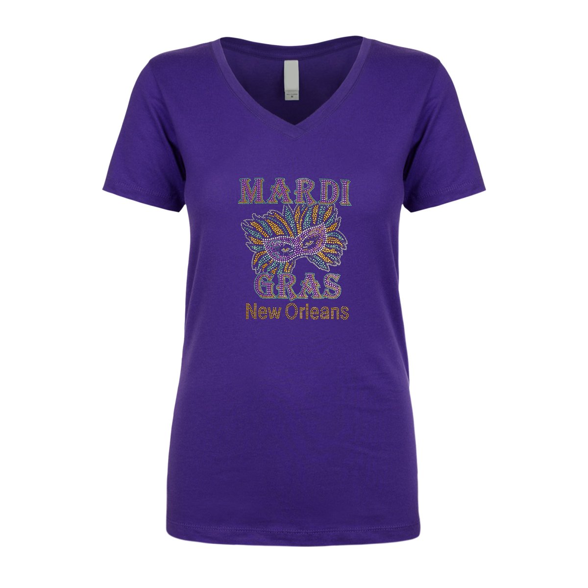 Step into the enchantment of Mardi Gras with our Ladies Mardi Gras and Mask Rhinestone V-Neck. Order now and shine with festive glamour at every celebration!