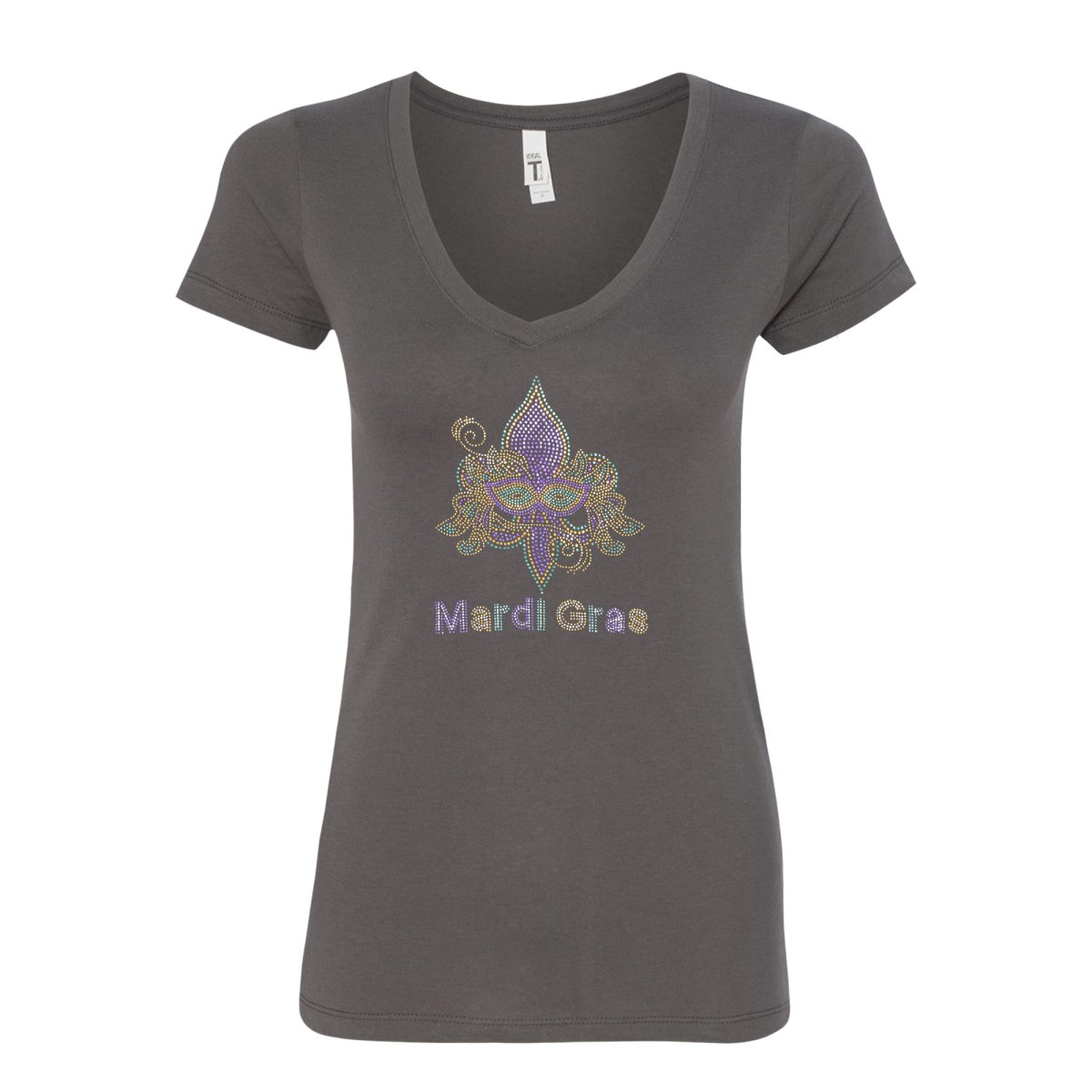 4. Versatile Glamour: Whether you're strolling through parades or attending Mardi Gras-themed events, this rhinestone-studded V-neck tee allows you to express your love for the celebration with a touch of glamour.