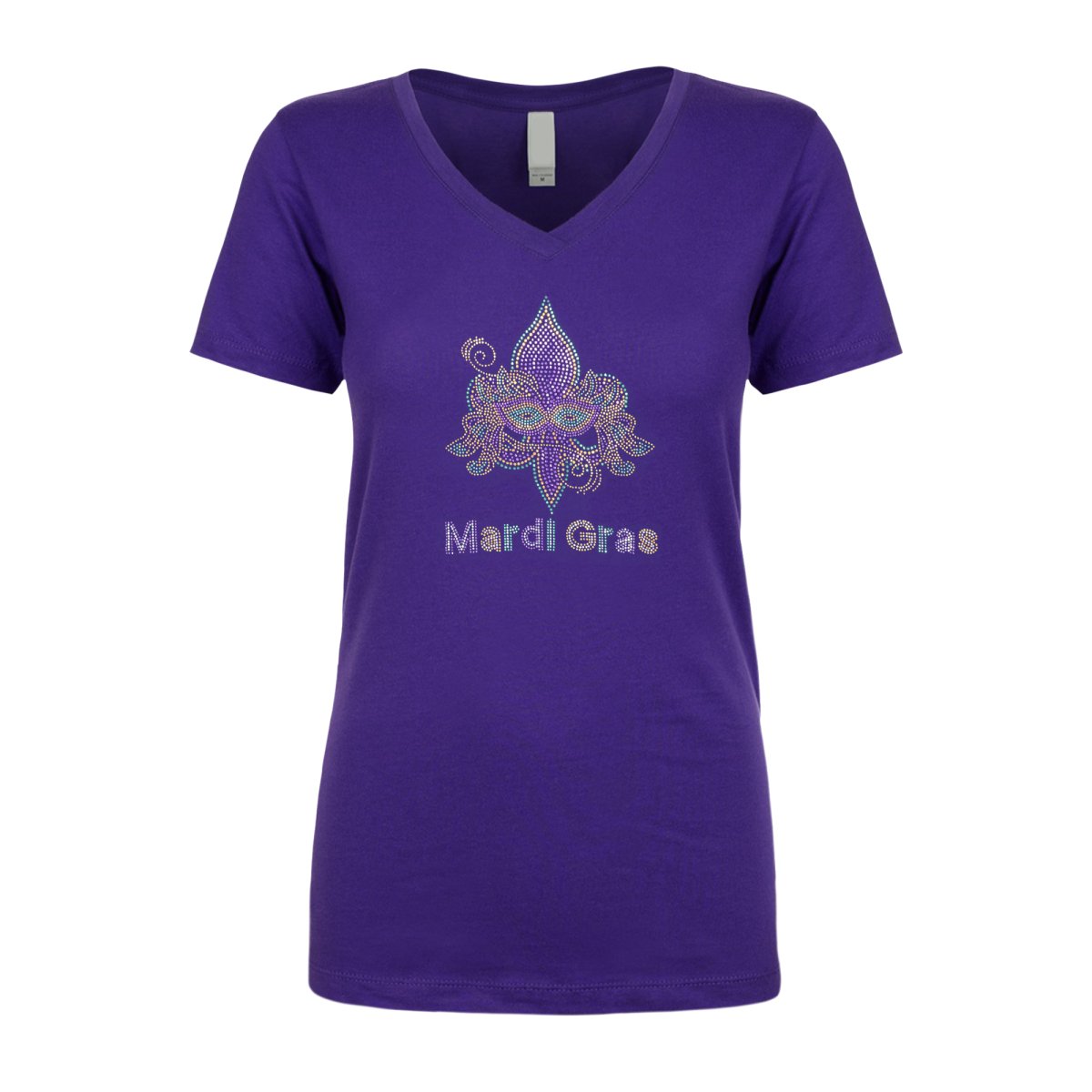 Ladies Mardi Gras Fleur De Lis Rhinestone V-Neck - Adult SM / Purple - Mardi Gras Apparel