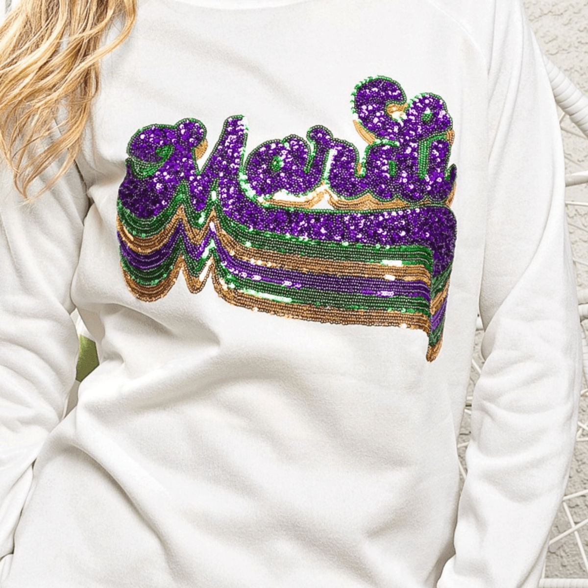 Step into Mardi Gras season with flair in this Layered Mardi Sequin Pullover, perfect for staying cozy while celebrating in style!