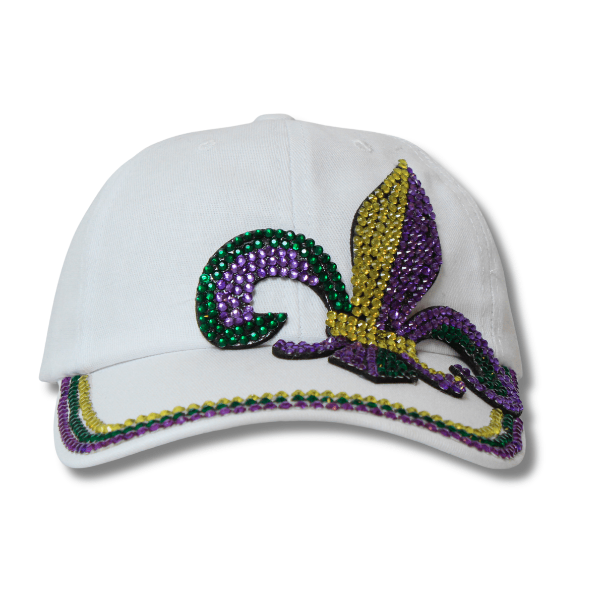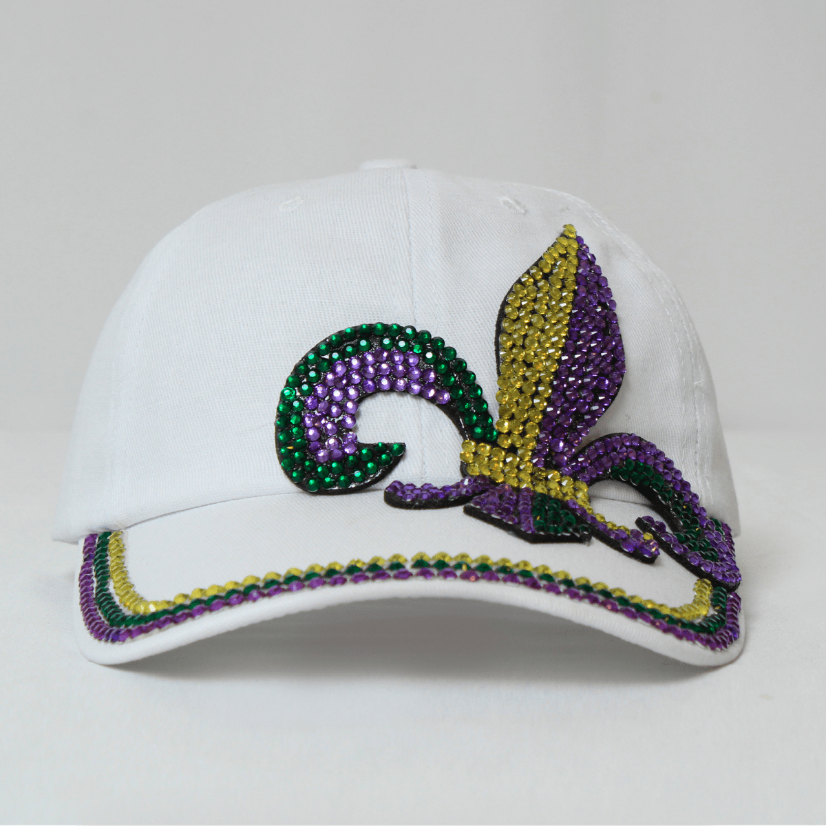 Celebrate Mardi Gras in style with this stunning black hat featuring a vibrant rhinestone Fleur-de-Lis design in traditional Mardi Gras colors—purple, green, and gold. The curved brim is adorned with matching rhinestone accents, creating a sparkling effect that captures the festive spirit. This adjustable hat is designed for comfort and a perfect fit, making it ideal for parades, parties, and all your Mardi Gras festivities.
