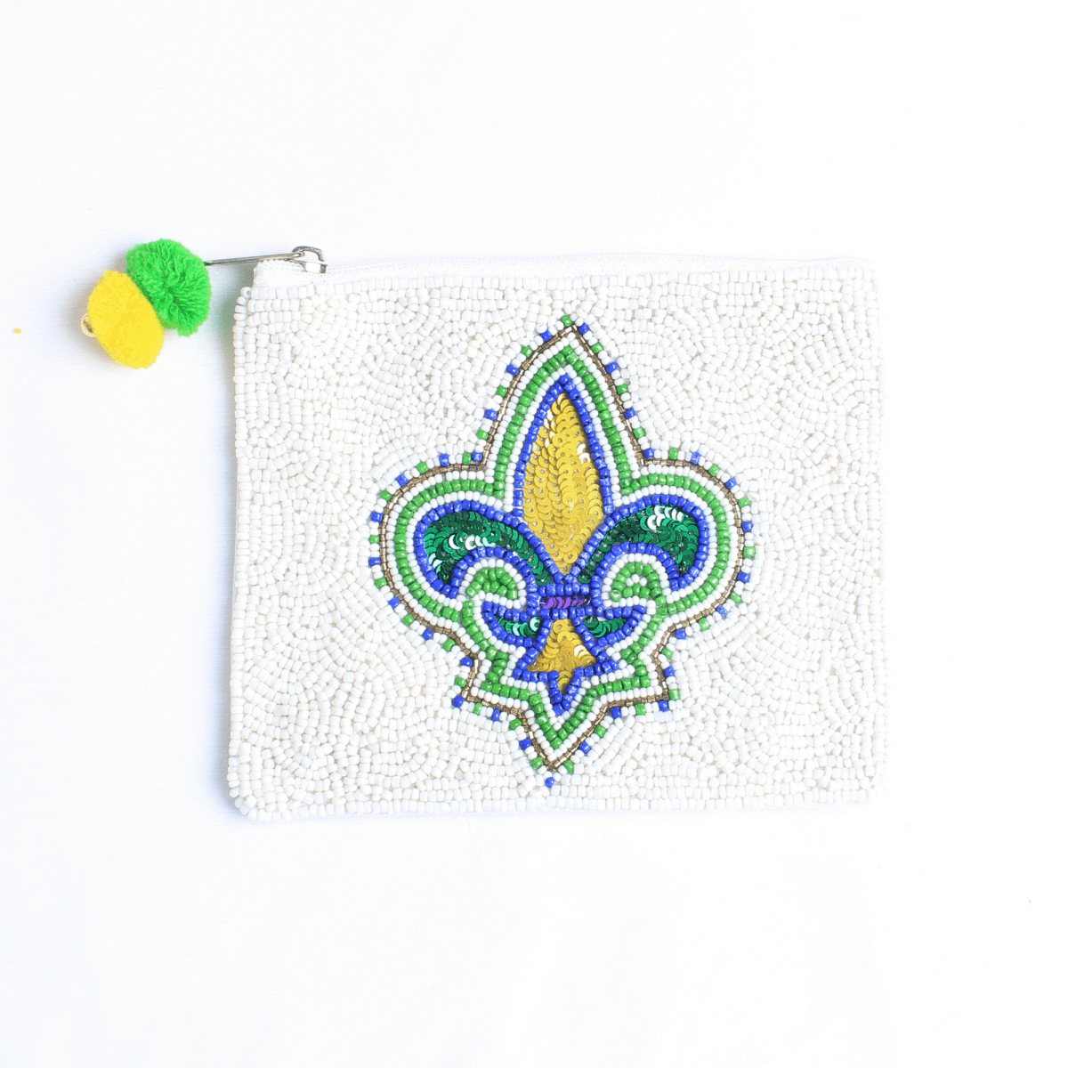 Make a sophisticated statement with the Mardi Gras Beaded Fleur-de-Lis Pouch! This handcrafted white beaded clutch showcases an intricate fleur-de-lis emblem adorned with gold, green, and blue beadwork and sequins, making it a dazzling and festive accessory. Designed with a secure zippered closure and a fun pom-pom charm, this compact pouch is perfect for carrying your essentials while celebrating in style.