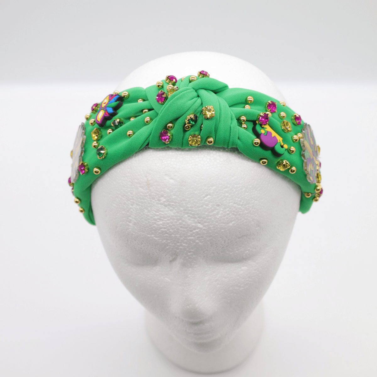Celebrate the joy of Carnival season with our Mardi Gras Beaded Green Rhinestone Headband for Women. This dazzling headpiece embodies the vibrant spirit of New Orleans with its bold green fabric adorned with sparkling purple, gold, and green rhinestones. Gold beads and playful Mardi Gras mask accents add a festive touch that perfectly captures the energy of parades and parties. The knotted design ensures a comfortable fit, keeping your style secure while you dance, celebrate, and “let the good times roll.” Whether you’re attending a Mardi Gras ball, parade, or themed event, this headband adds the perfect pop of color and sparkle to any outfit. Designed to be lightweight yet eye-catching, it’s ideal for all-day wear. Pair it with matching Mardi Gras earrings or accessories for a coordinated look that shines from day to night.