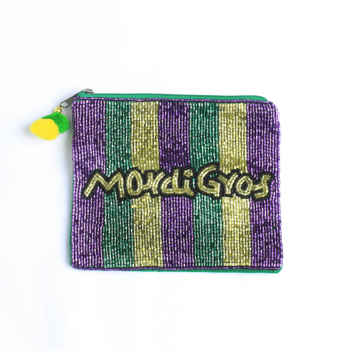 Shine bright this Mardi Gras with this stunning sequin pouch! Designed with bold purple, green, and gold stripes, this shimmering accessory is perfect for storing small essentials while adding a festive flair to your look.