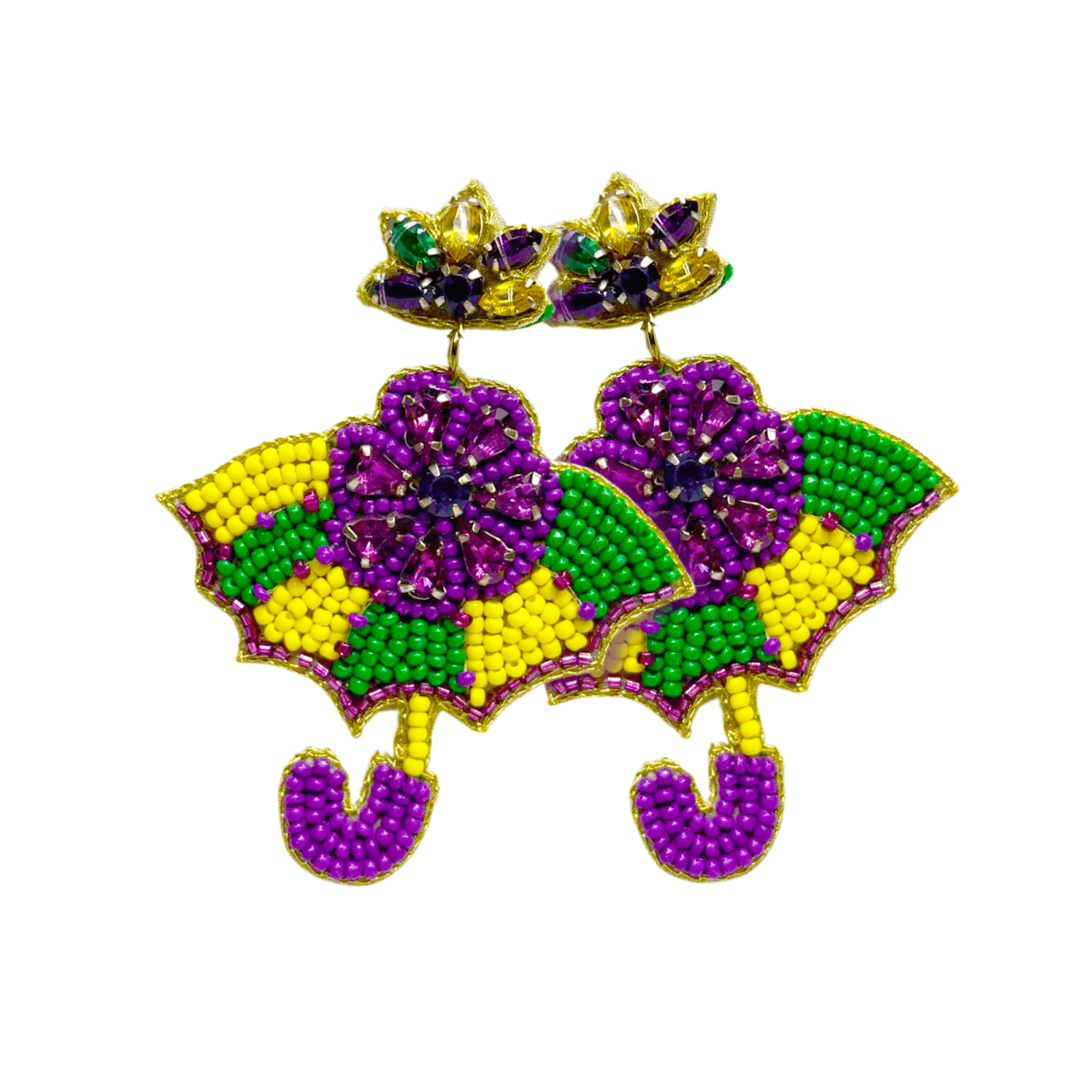 Celebrate Mardi Gras in style with these Mardi Gras Beaded Umbrella Earrings! Featuring intricate beadwork in traditional purple, green, and gold, these statement earrings are designed in the shape of an umbrella, adorned with sparkling details and a floral accent. Perfect for parades, parties, and festive gatherings, these earrings add a bold and playful touch to your carnival look.