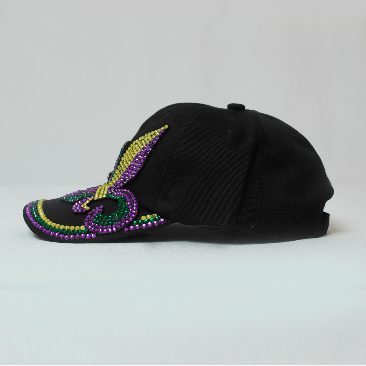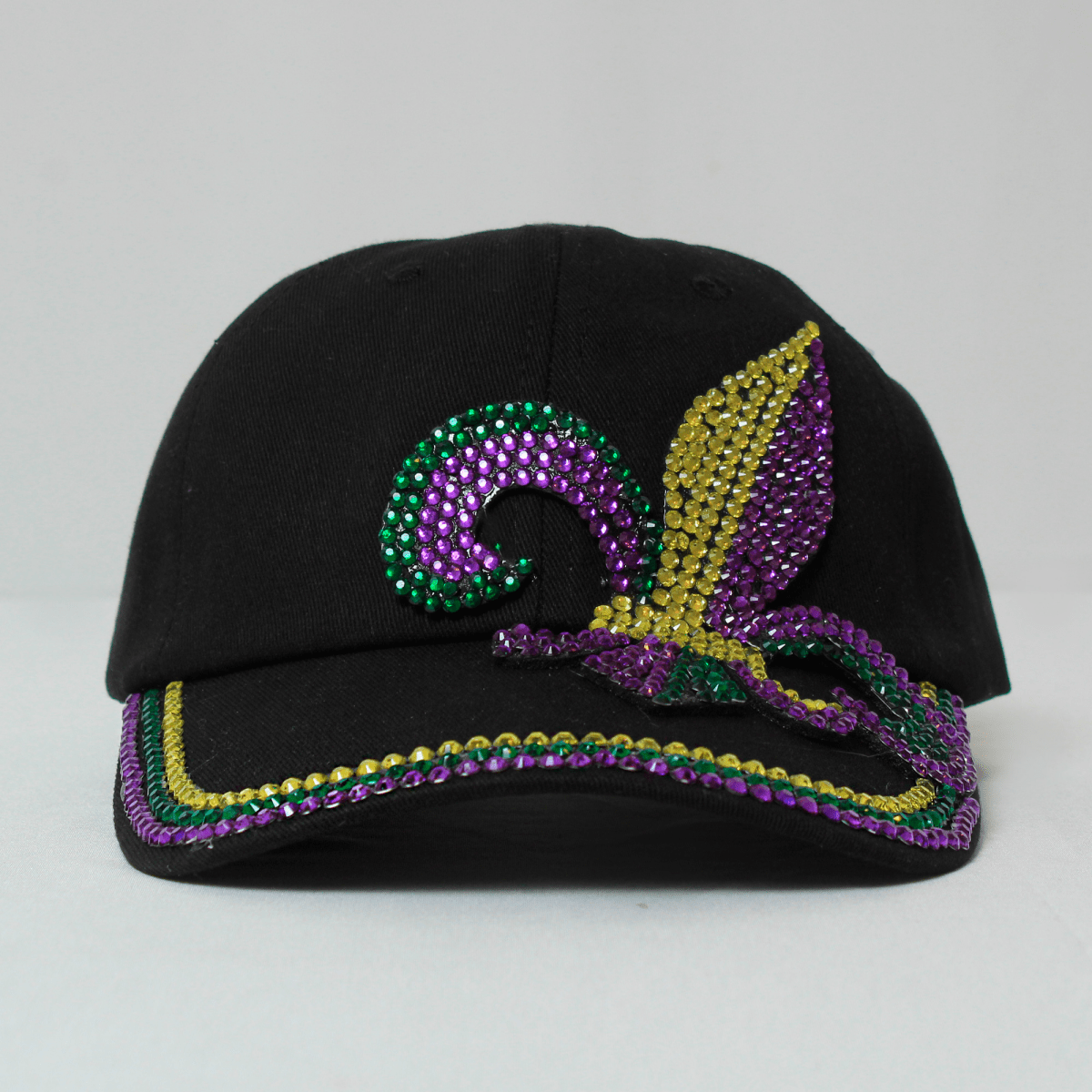 Celebrate Mardi Gras in style with this stunning black hat featuring a vibrant rhinestone Fleur-de-Lis design in traditional Mardi Gras colors—purple, green, and gold. The curved brim is adorned with matching rhinestone accents, creating a sparkling effect that captures the festive spirit. This adjustable hat is designed for comfort and a perfect fit, making it ideal for parades, parties, and all your Mardi Gras festivities.