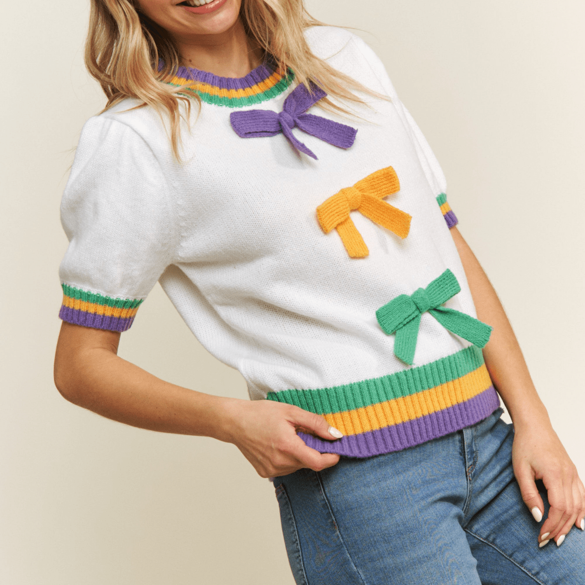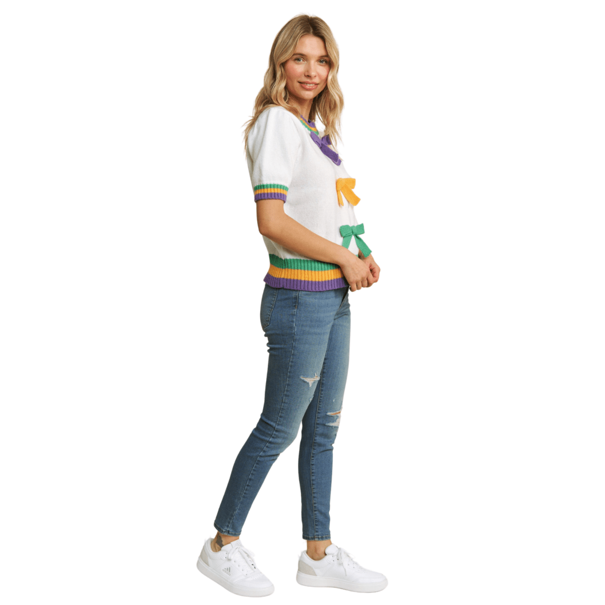 This Mardi Gras Bow Detail Puff Sleeve Pullover Top is the perfect blend of playful charm and vibrant style. The attention to detail with the bow accents and puff sleeves makes it a standout piece, ensuring you’re parade-ready with comfort and flair.