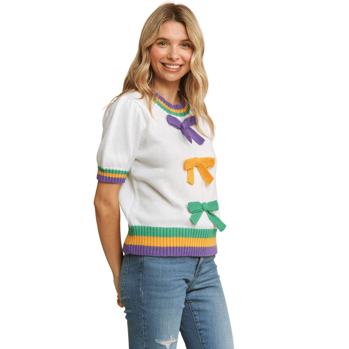 Celebrate in style with this Mardi Gras Bow Detail Puff Sleeve Pullover Top. Designed with vibrant Mardi Gras colors, this top combines playful charm with chic elegance, perfect for all your festive events.