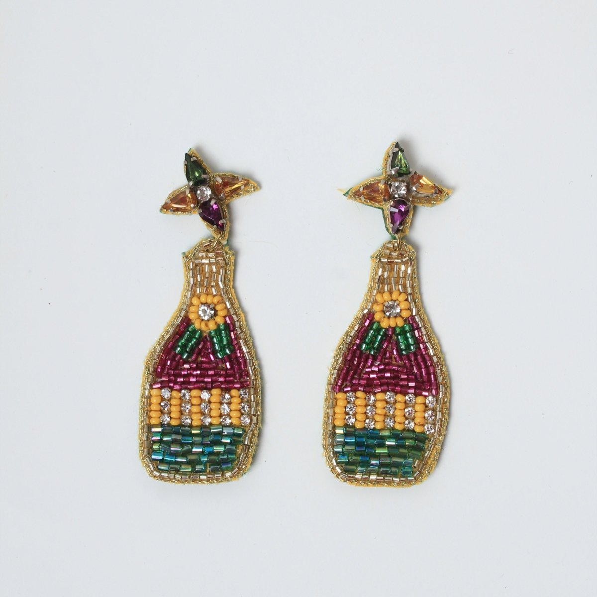 Mardi Gras Champagne Bottle Beaded Earrings with Rhinestones Top