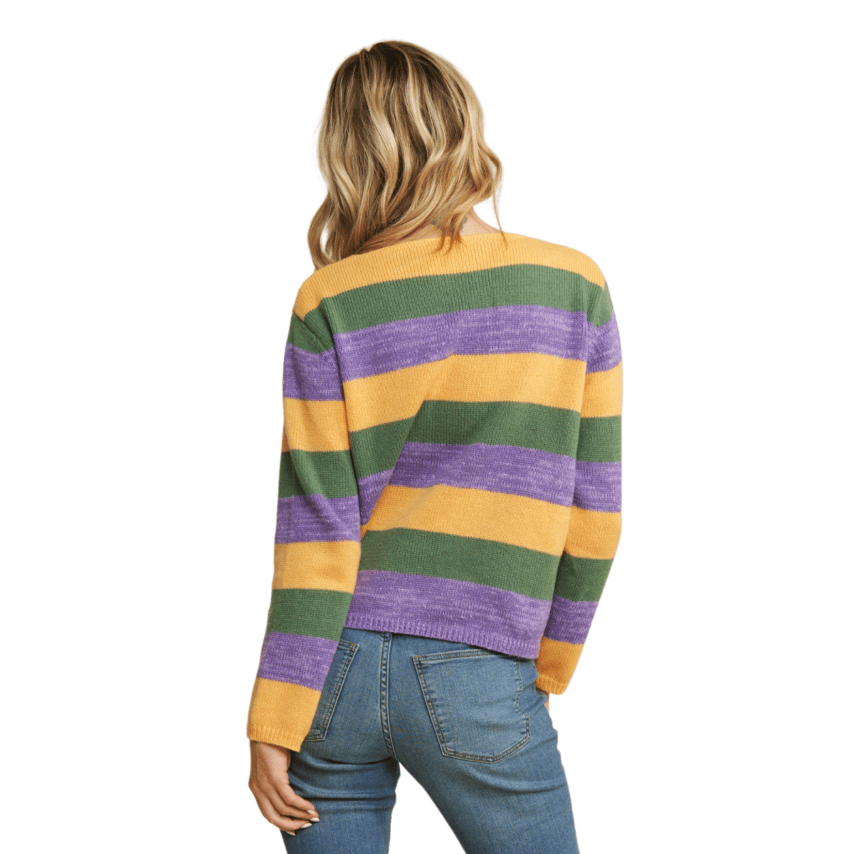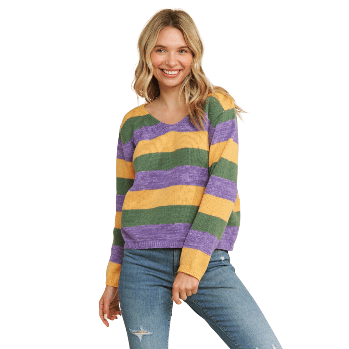 Get ready for Mardi Gras celebrations with this colorful striped pullover! Designed for comfort and style, this soft-knit sweater features bold purple, green, and gold stripes in a relaxed fit. Perfect for layering, it offers warmth and a flattering V-neckline with ribbed details on the hem, cuffs, and neckline.