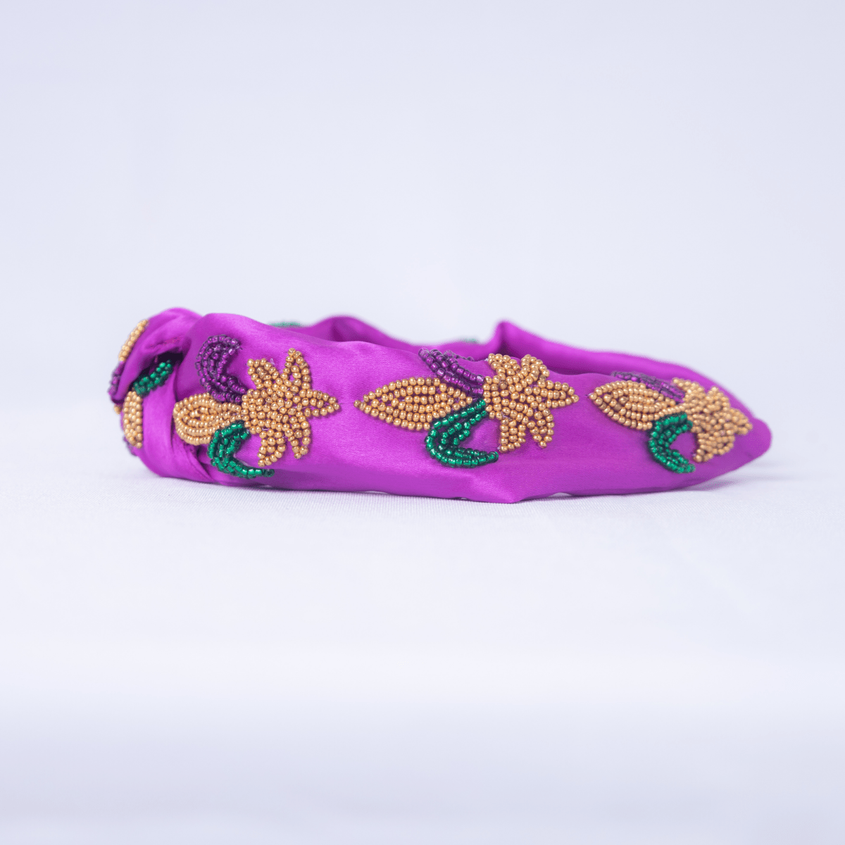 Complete your Mardi Gras look with this stunning purple satin headband. Featuring detailed gold and green beaded fleur-de-lis designs, this accessory exudes festive charm and sophistication. Whether you're attending a parade or celebrating at a party, this headband is both stylish and comfortable, making it an essential addition to your Mardi Gras ensemble.