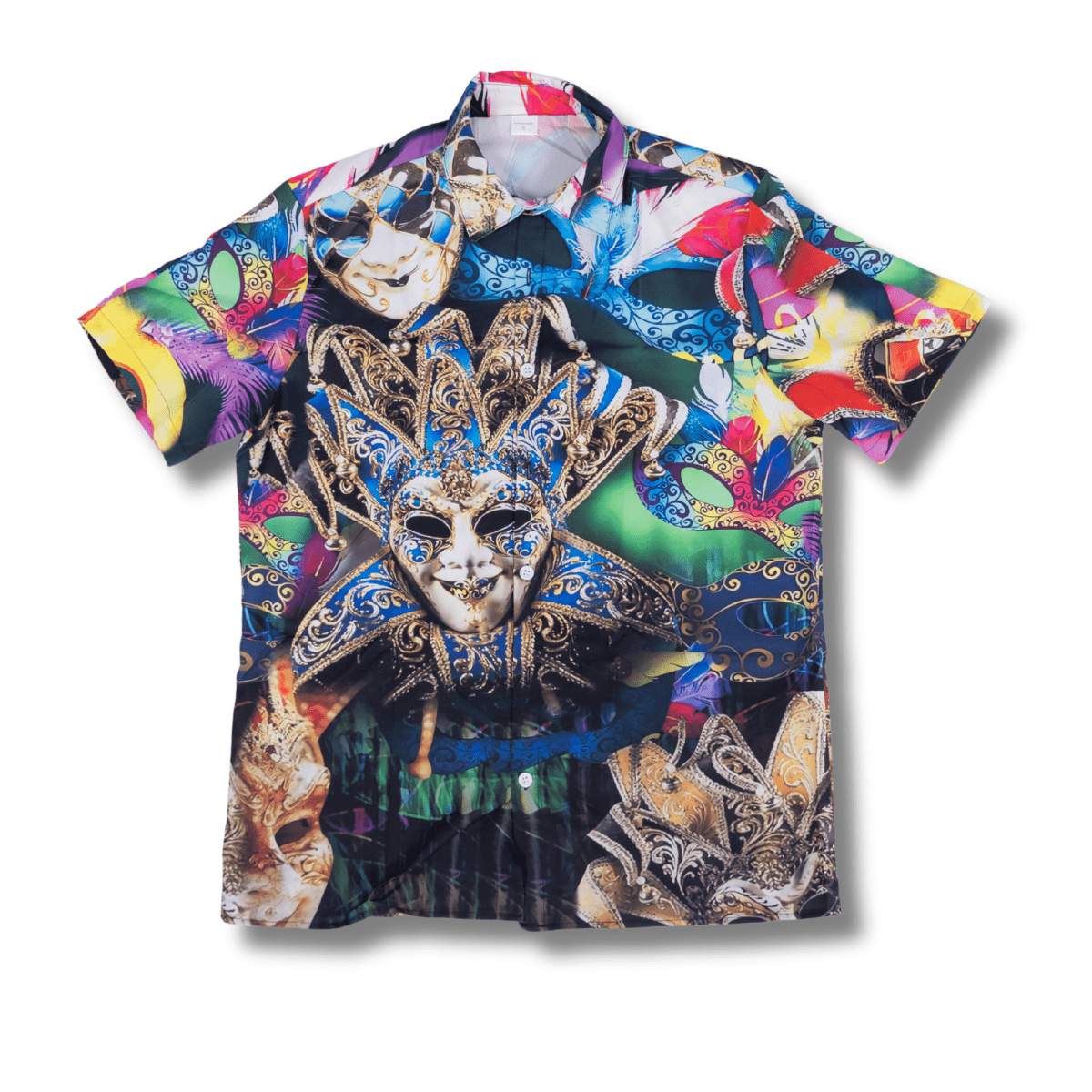 Step into the vibrant world of Mardi Gras with our Festival Mask Collage Button-Up Shirt. This eye-catching design features an intricate collage of traditional Mardi Gras masks in bold and festive colors. Crafted for comfort and style, this shirt is perfect for parades, parties, or any celebration that calls for a festive flair.