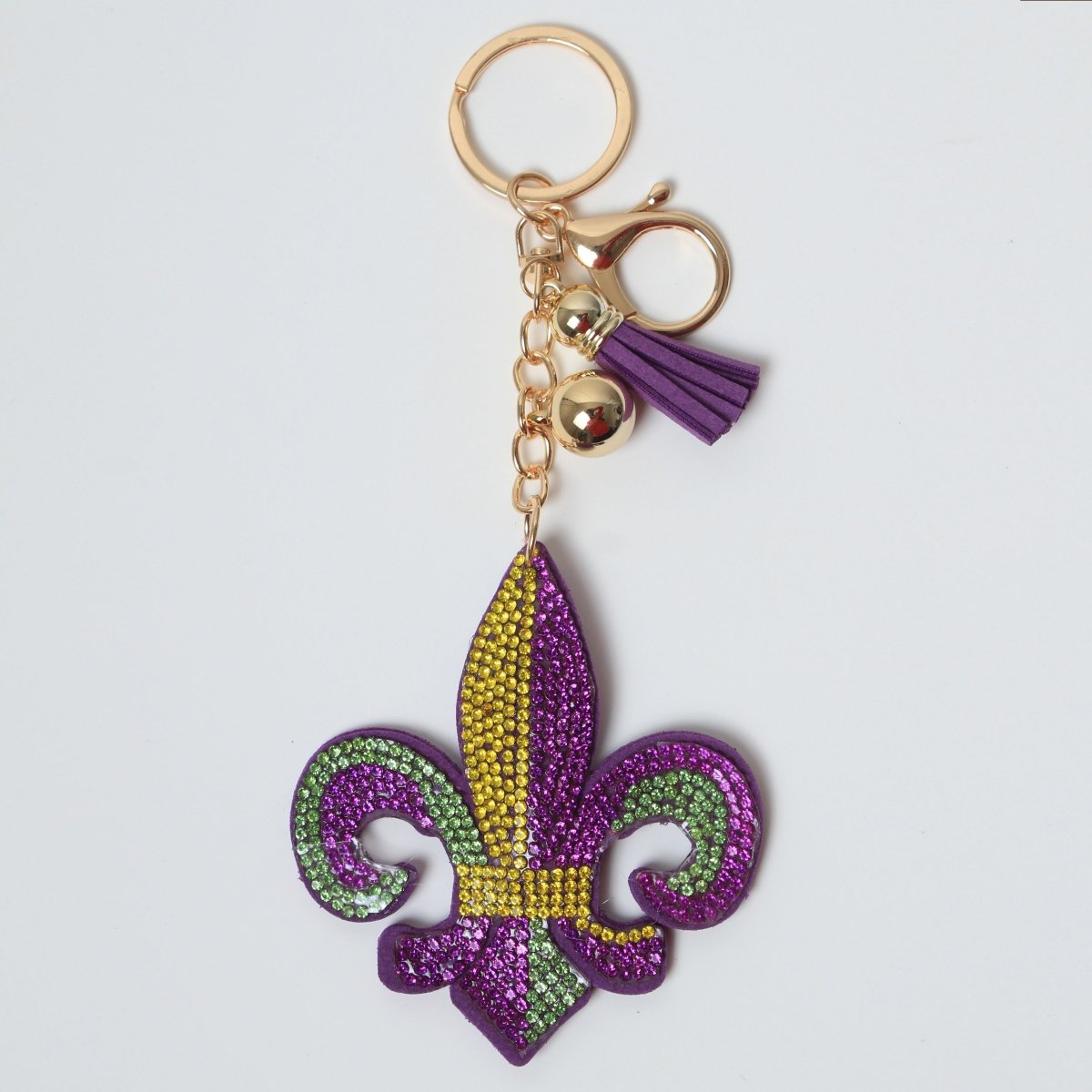 Celebrate in style with this dazzling Mardi Gras Fleur-de-Lis Rhinestone Keychain. Adorned with sparkling purple, green, and gold rhinestones, this iconic fleur-de-lis design captures the spirit of Mardi Gras festivities. The gold-tone key ring and a matching purple tassel add a stylish touch, making this keychain perfect for organizing your keys or decorating your bags. Whether you're at a parade or want to show your love for Mardi Gras year-round, this eye-catching keychain is the ideal accessory.