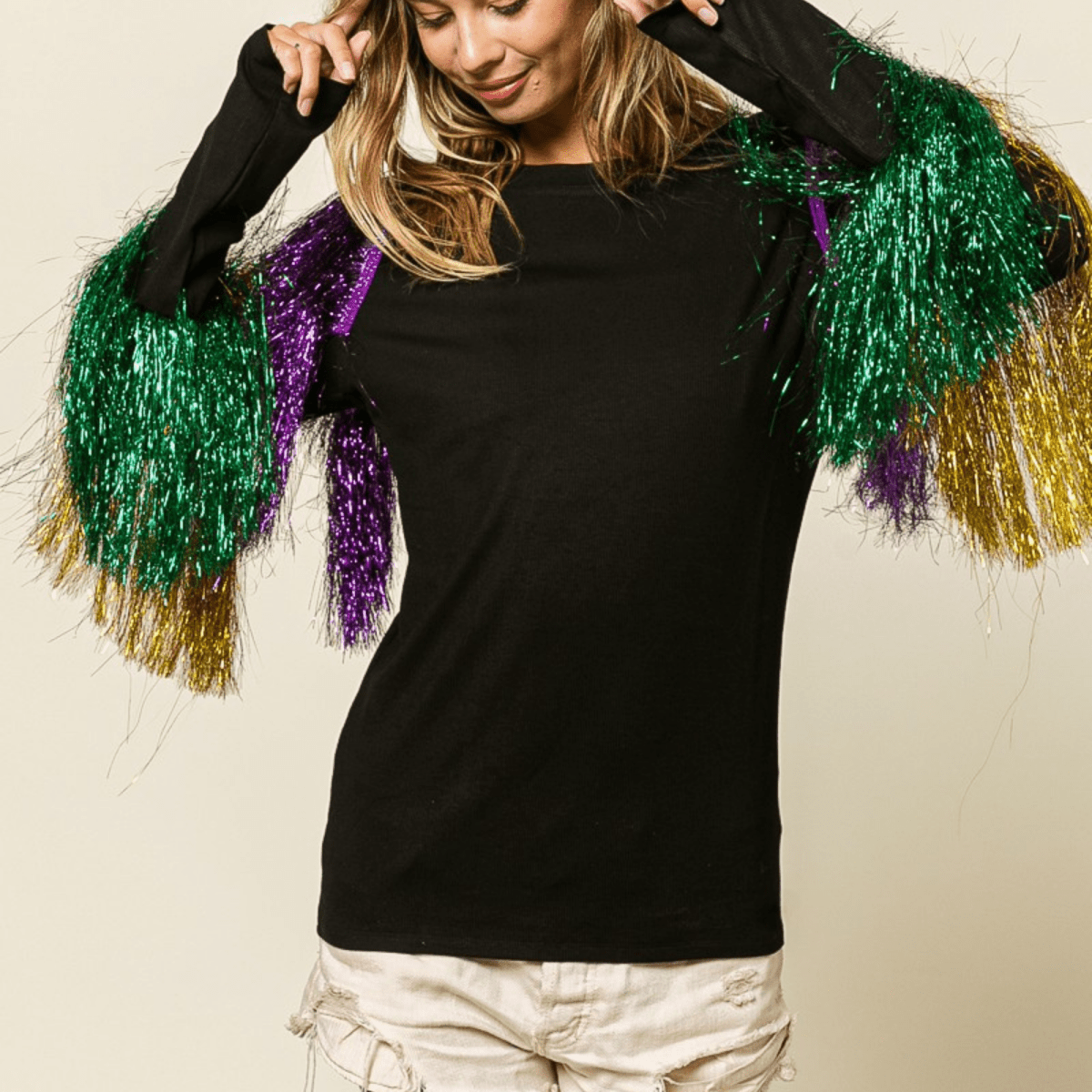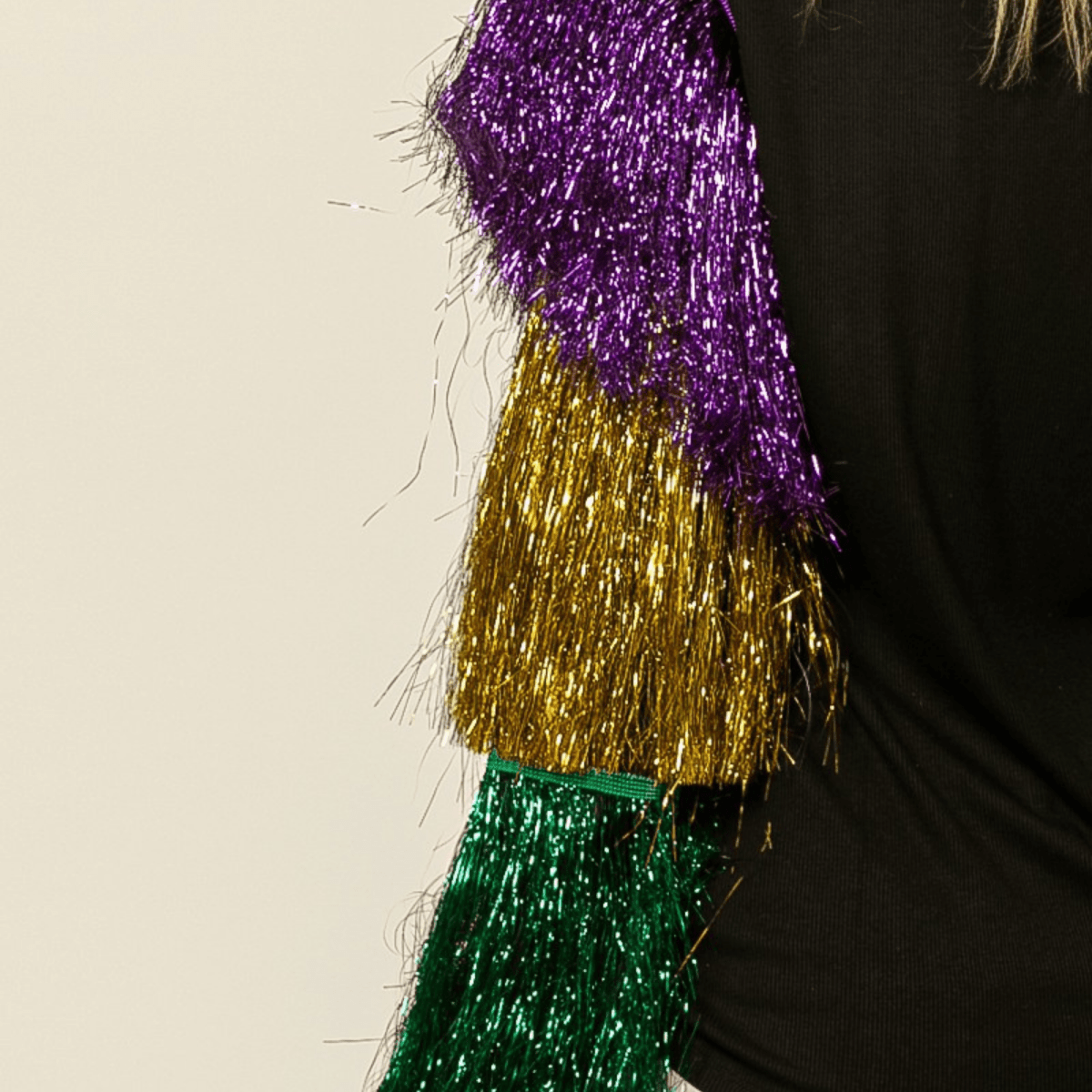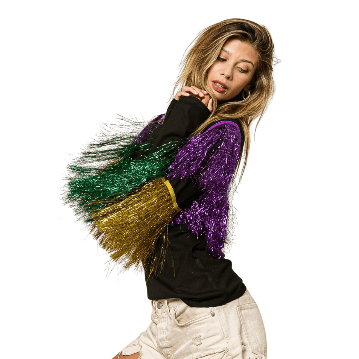 Unleash the spirit of New Orleans with our Mardi Gras Black Top With Colorful Tiered Tinsel Fringe. This dynamic top features a classic black backdrop accented with tiers of vibrant tinsel fringe in Mardi Gras's traditional colors of purple, green, and gold. The centerpiece of the design is the 'Mardi Gras' script across the chest, spelled out in sparkling sequins that catch the light with every movement. Perfect for parade watchers, party-goers, and anyone ready to dance the night away in style.
