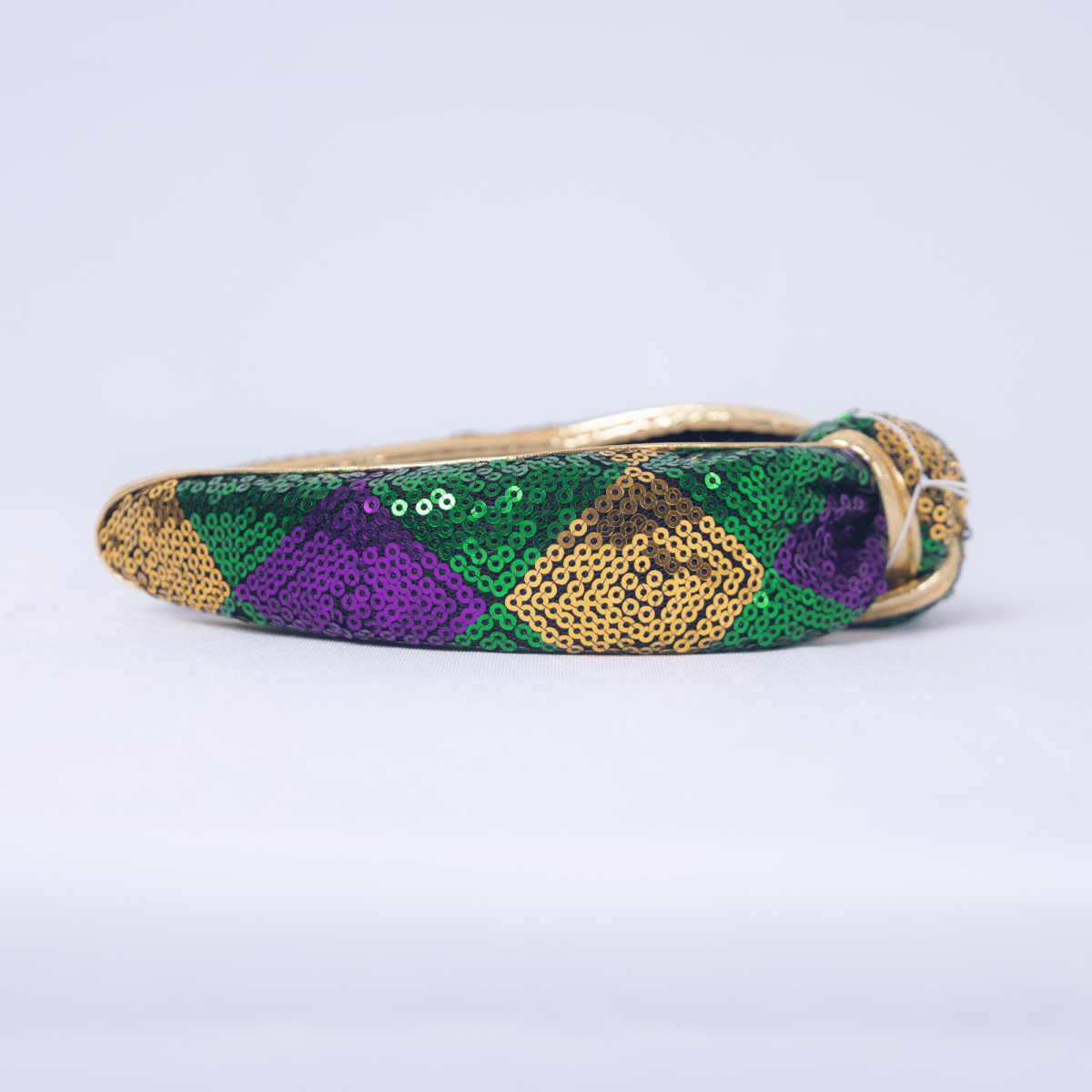 Add a touch of Mardi Gras glamour to your look with the Mardi Gras Harlequin Sequin Headband. This dazzling accessory features an intricate diamond pattern in vibrant purple, green, and gold sequins, exuding festive charm. Its comfortable fit and lightweight design make it the perfect accessory for long parades, parties, and Mardi Gras celebrations.